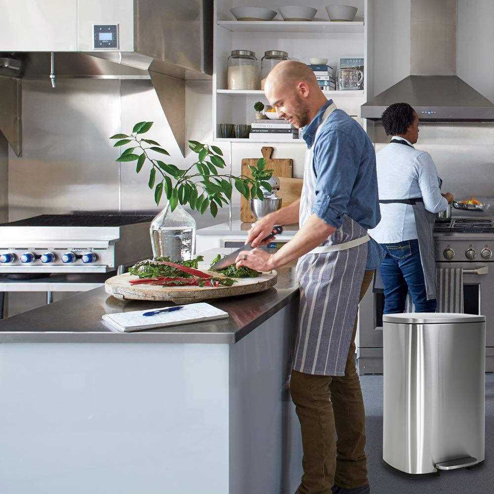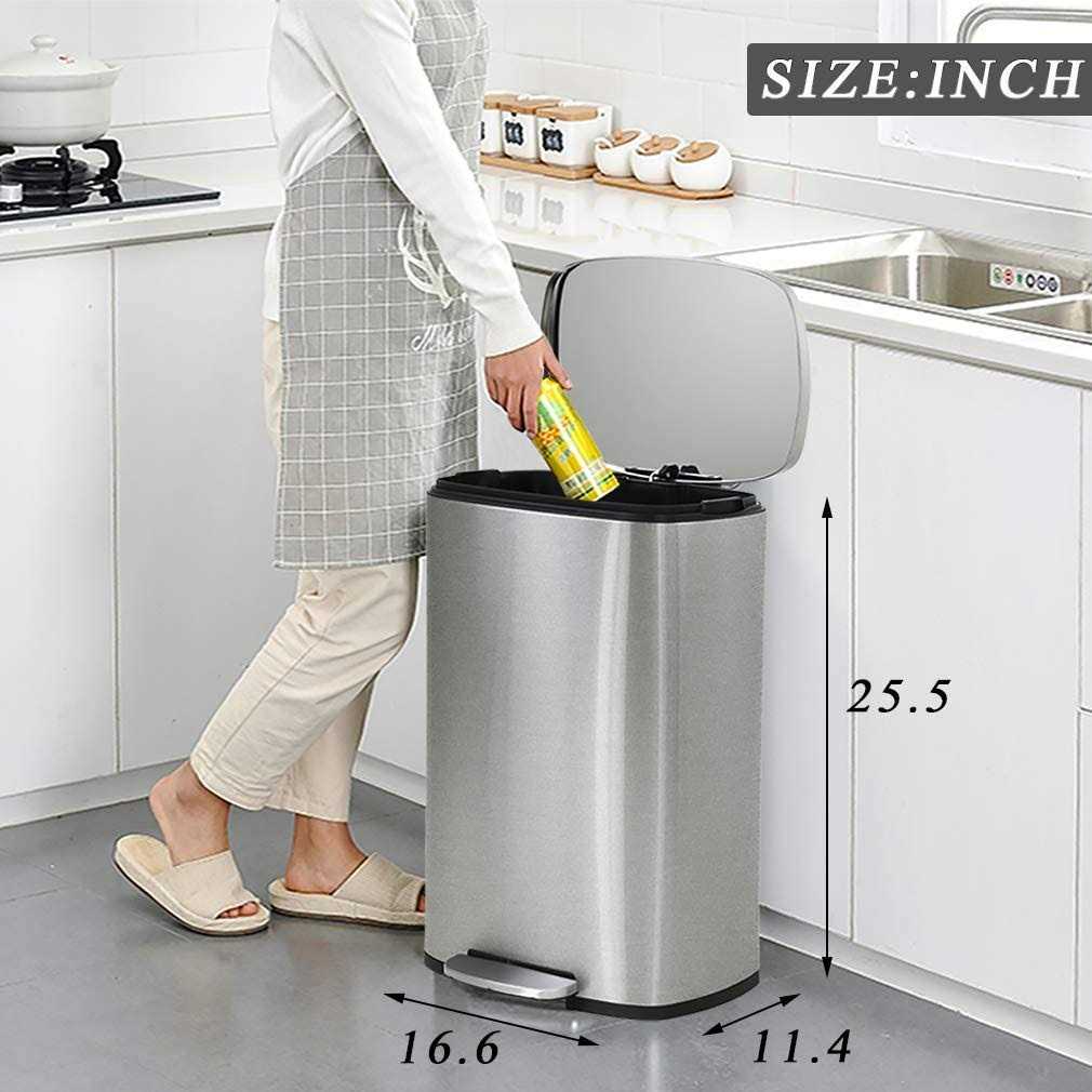 Dkeli Kitchen Trash Can with Soft Slow Lid Pedal Step Trash Can with Removable Plastic Inner Bucket Stainless Steel Garbage Can for Bathroom Kitchen and Office Trash Bin 13 Gallon / 50 Liter Silver Color Stainless Steel Brand Dkeli Capacity 13 Gallons Material Stainless Steel Item Dimensions LxWxH 16.6 x 11.4 x 25.5 inches Opening Mechanism Step-On Item Weight 17.5 Pounds 【HIGH-QUALITY MATERIALS】: Our kitchen trash can are made of high-quality stainless steel, and the dirt on the brushed surface of stainless steel can be easily removed with a rag. The surface of the garbage can is specially treated to have anti-fingerprint function. Even if it is used frequently, there is no need to worry that the surface of the trash bin becomes dirty, it can keep the garbage clean for a long time.kitchen trash can garbage can trash bin 【LARGE CAPACITY】: 13 gallons of trash can definitely meet your daily use. The regular 13 gallon garbage bag in the supermarket can be used in our stainless steel trash can, you can use a larger garbage bag, and the lid of the trash can is detachable. It is convenient for you to put in and take out the garbage bag.trash bin kitchen trash can garbage can 【SILENT SLOWDOWN】: Conventional trash can generate a lot of noise during use. Our kitchen garbage uses deceleration technology, the opening and closing does not make a lot of noise, and the humanized deceleration design avoids the process of people using the step trash can. Made in noise, very suitable for study or bedroom.trash bin garbage can kitchen trash can 【ISOLATION OF ODOURS】: Our trash bin have a good seal. If you don’t want the entire house to smell like a trash can, you can tap the lid with your foot to open the lid. Our trash cans can also be opened at different angles depending on the strength you use.kitchen trash can trash bin garbage can 【SUITABLE FOR DIFFERENT PLACES】: Our garbage can are elegant and beautiful enough to fit anywhere, such as kitchens, bedrooms, study, office and more. And there is a handle on the back of the trash can. When you need to move the trash can, you can use the handle, which will make it easier to place it where you want it.kitchen trash can garbage can trash bin