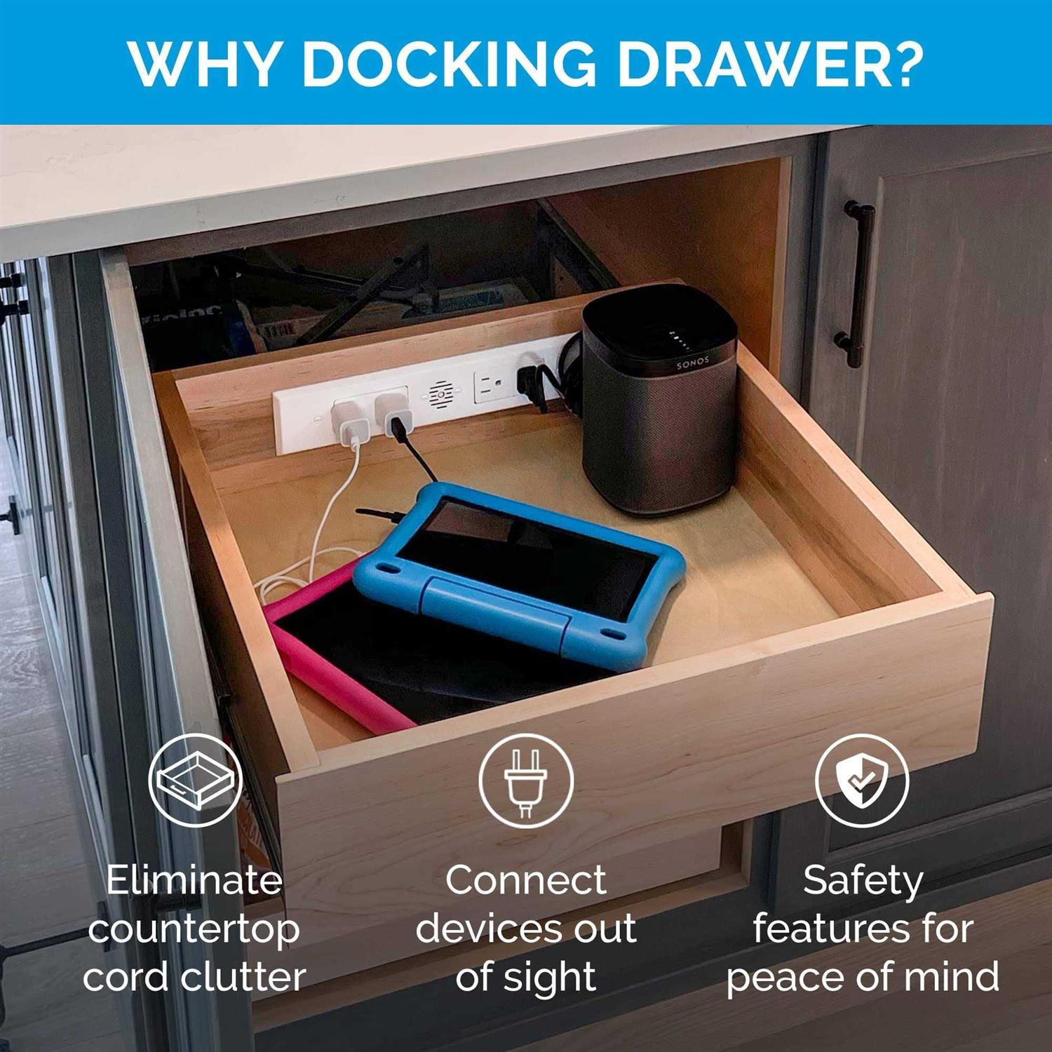 Install Docking Drawer Blade Series outlets into any drawer to create purposeful and functional spaces that eliminate countertop cord and device clutter. SMART Offers both charging AND powering capabilities in a single solution. SIMPLE Designed in one size for any drawer type, this outlet plugs directly into the wall with a 4.5′ cord, simplifying electrical planning and lowering project costs. SAFE Certified for use in the US and Canada. Featuring an interlocking thermostat that de-energizes the outlet when the surrounding temperature exceeds 120F.