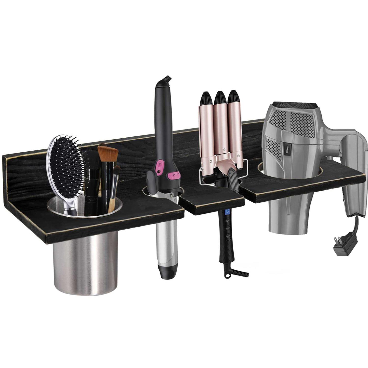 DORAMII Bathroom Wall Mount Hair Dryer Holder Hair Care & Styling Tool Organizer Farmhouse Wooden Beauty Hair Appliance Holder for Flat Iron Curli