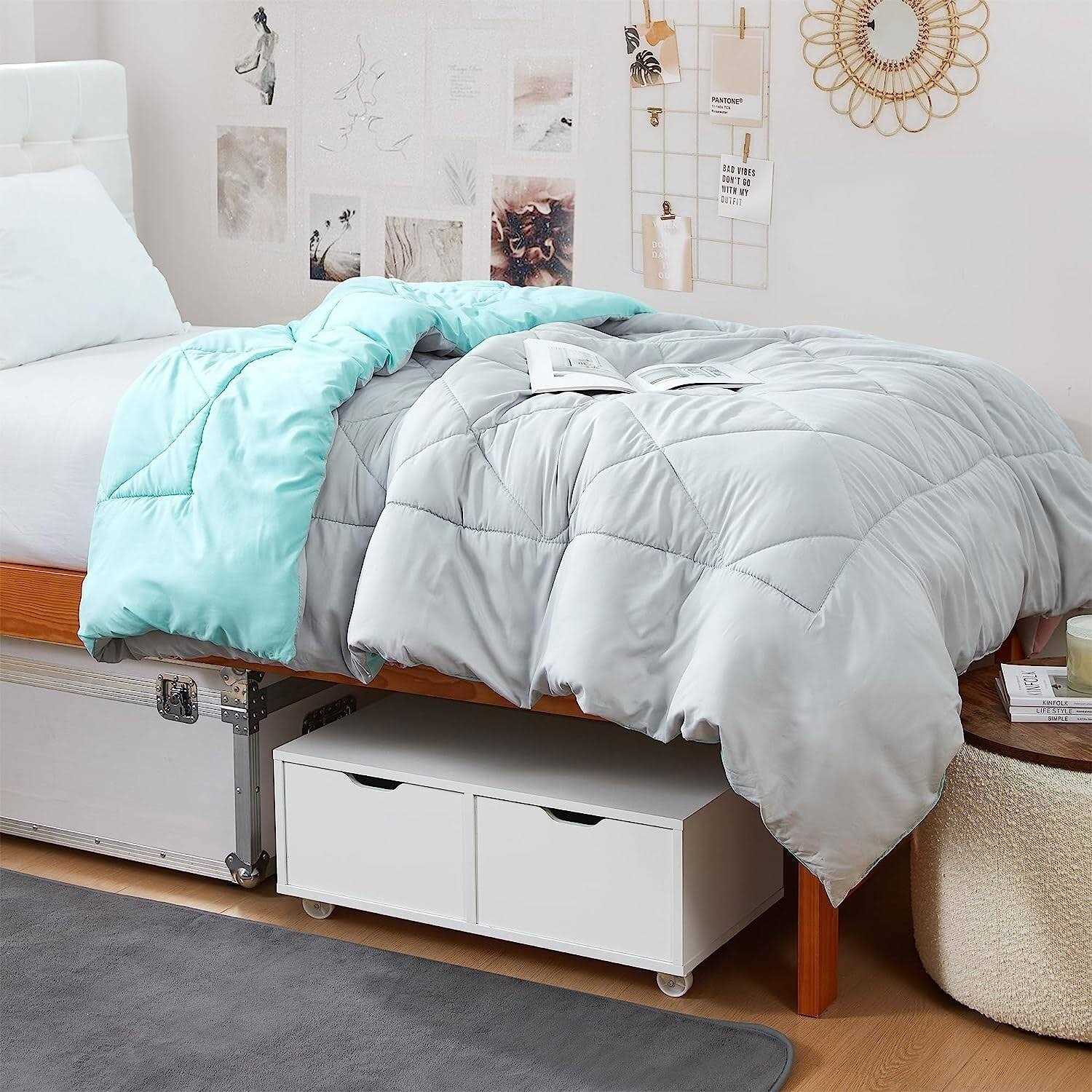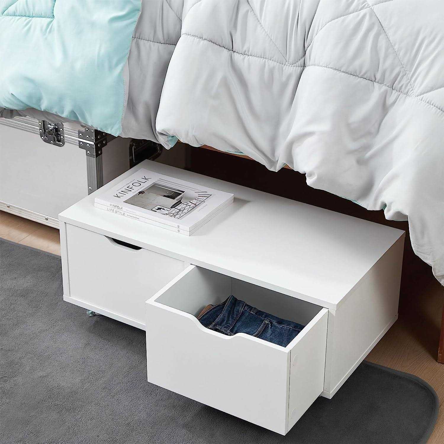 - With two drawers, this underbed storage solution on wheels will keep your personal belongings off the floor and easily accessible.