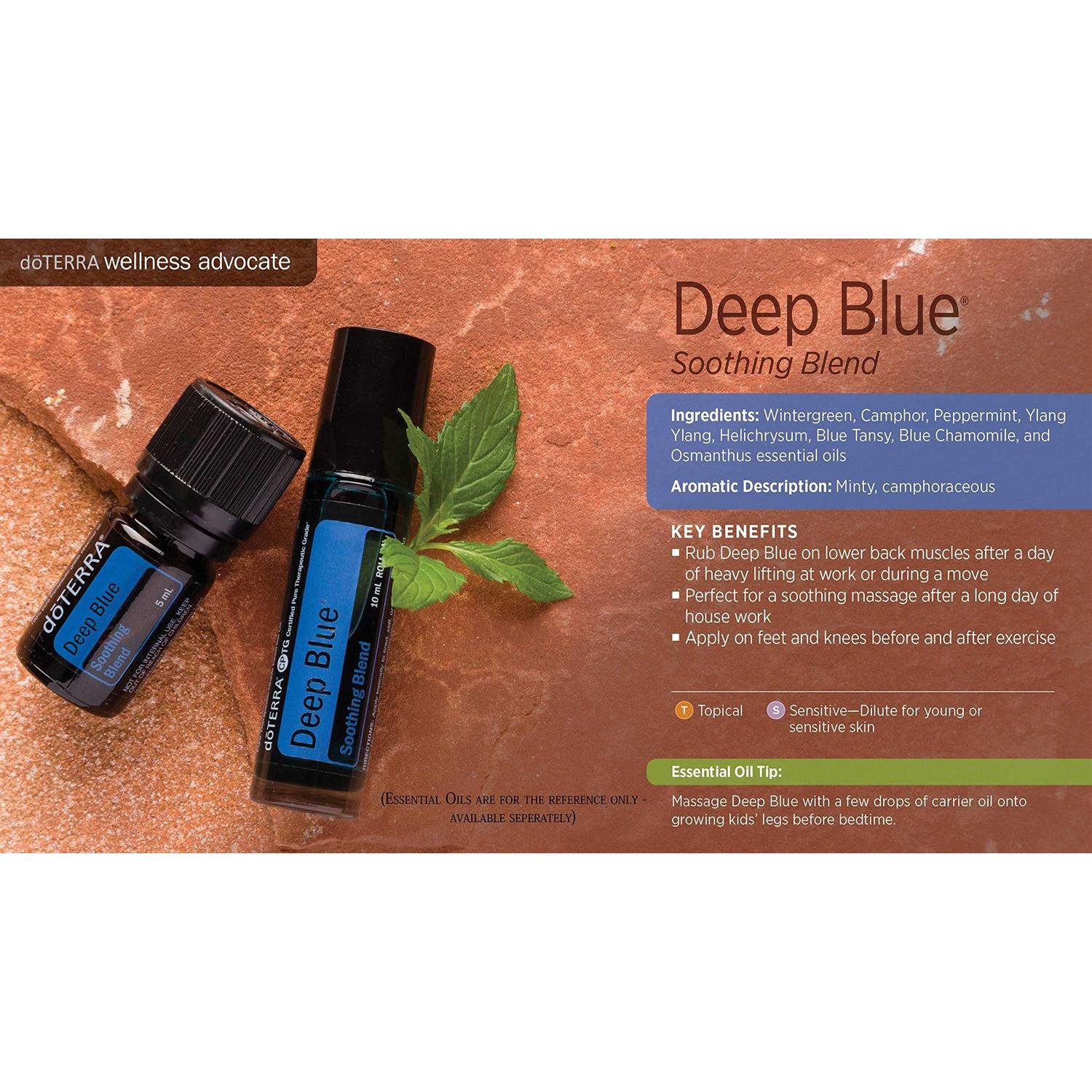 - Formulated with doTERRA s proprietary Deep Blue Soothing Blend of Certified Pure Therapeutic Grade essential oilsclose to 5 ml of oil per 4 oz tube!