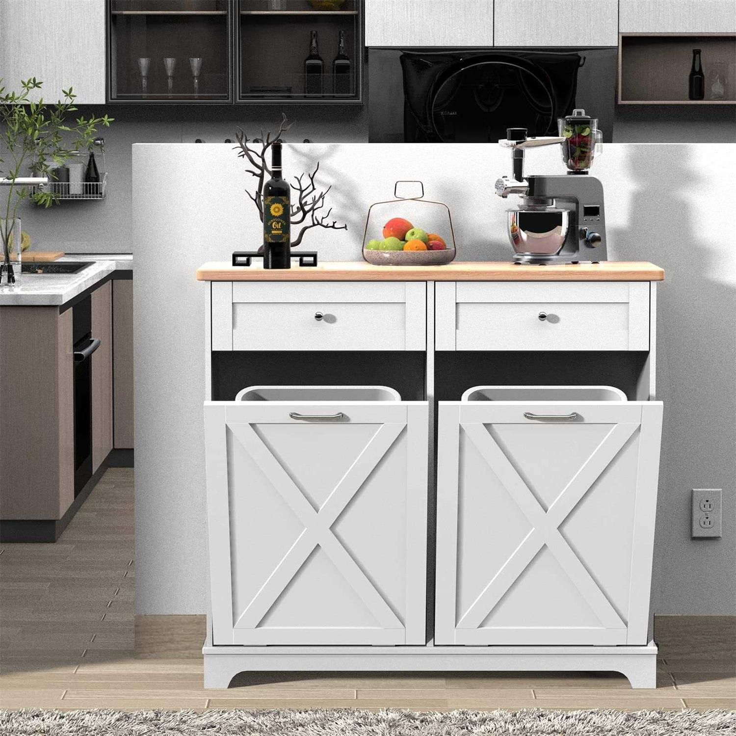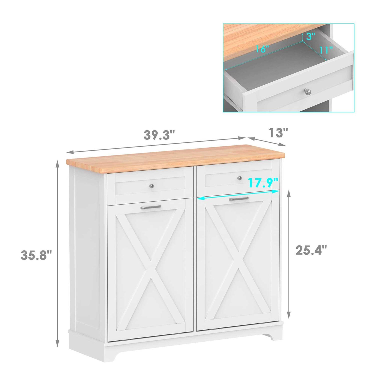 Feature: Space Saving and Concealment:Double Tilt-out trash cabinet 35.8 “H x 39.3 “L x 13 “W (for 2 x 10 gallon trash cans), which can hide the trash cans well, keep the kitchen delicate and the floor clean. It also blocks odors from emanating, while your pets will never knock over the trash cans anymore New Update Farmhouse Style Barn Door: The cabinets are simple and practical in design, perfect for dressing up your kitchen, home, apartment, dorm room, laundry room, etc. Combined with 2 pull-out drawers, you can store kitchen supplies, pet food, and the slanted drawer below can even be used as a laundry cabinet Kitchen Safety Material:Our trash bin cabinet made of MDF wood with a polished coating, our garbage cabinets are simple, luxurious, and easy to clean. All wood panels used in our products are perfectly compliant with the California Air Resources Board (CARB) P2 requirements Durable and Stable:cabinet support is stable enough to hold up to a 35 lb (ca. 16 kg). Our Trash can, a perfect match for a 13-gallon trash can. Rubberwood top surface provides extra cutting space, and can easily withstand even a microwave and coffee maker Notice Happy Service:Please clean up in time to prevent bacteria growth. Excessive trash can cause damage to the cabinet door Specification: Capacity: 20 Gallons Color: 10 Gallon-Double White Opening: Mechanism Pull-Out Material: Engineered Wood Product Dimensions: 35.8 “H x 39.3 “L x 13 “W
