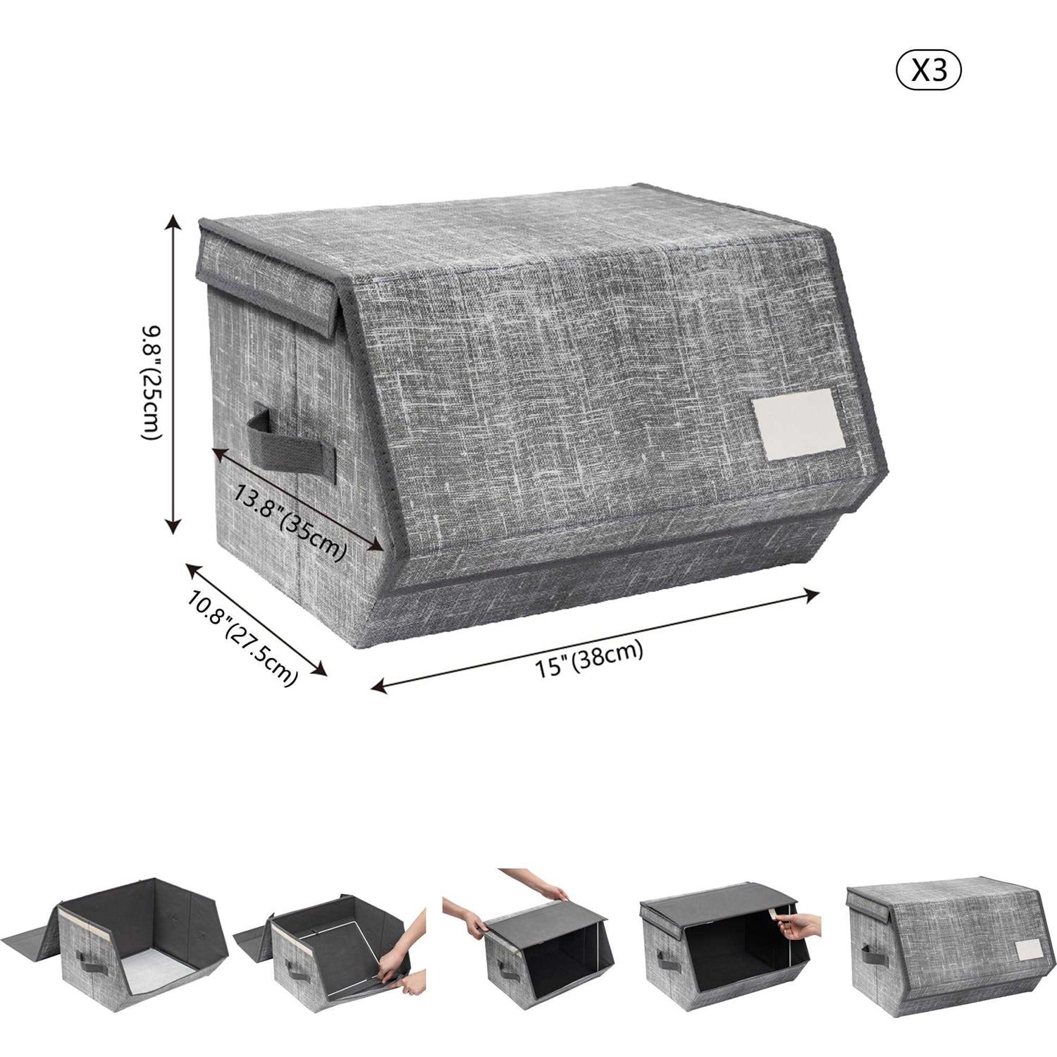 DOVAMY Stackable Storage Bins, Set of 3 Storage Drawers for Clothes, Cube Organizer with Lid, Fabric Toy Storage Box, 15”L x 13.8”W x 9.8”H, Light