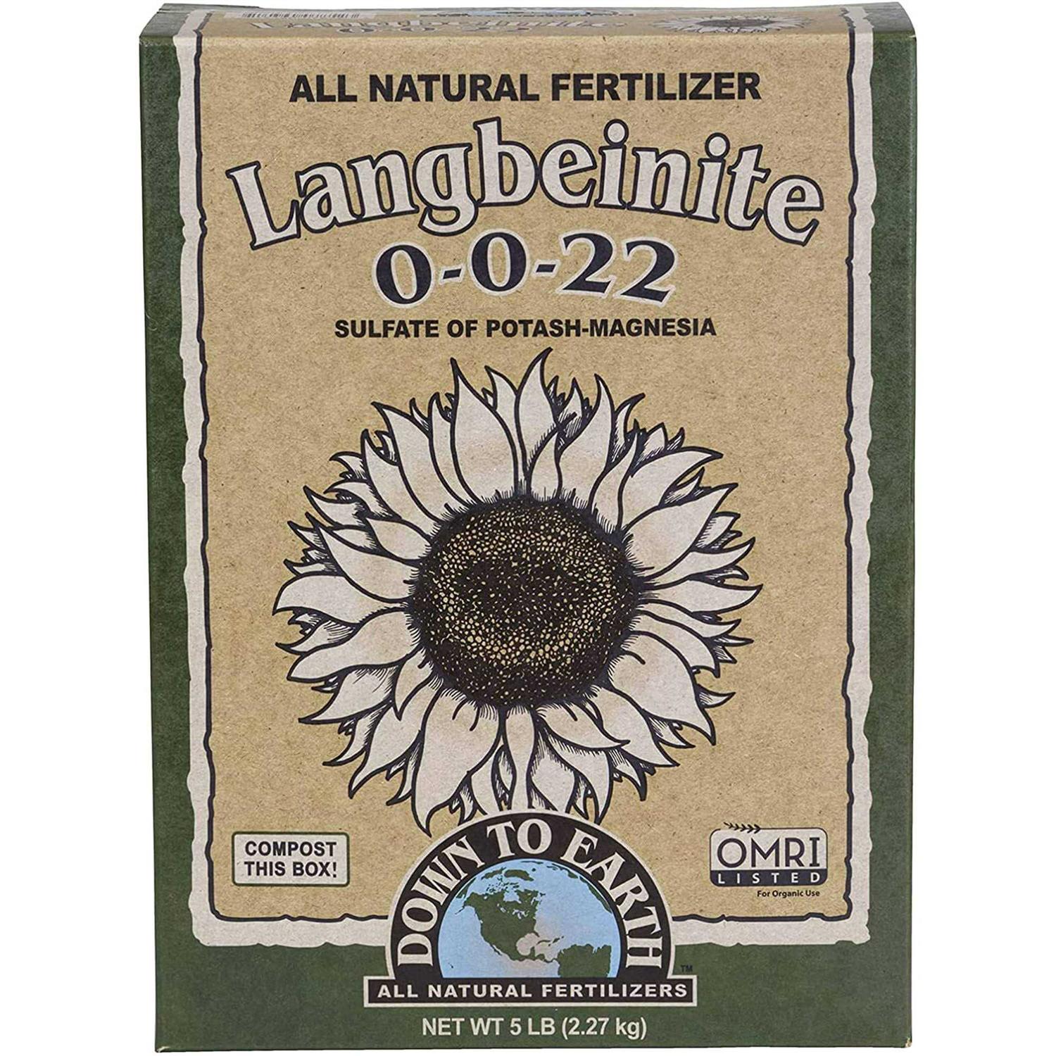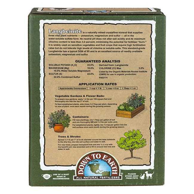 A unique 3-in-1 combination of Potassium Magnesium and Sulfur Langbeinite is a naturally occurring source of these three vital plant nutrients. Potassium is essential for high quality fruit Magnesium is required for the synthesis of chlorophyll and Sulfur is needed for enzyme activation. Contains 22% K2O 11% Mg and 22% S.