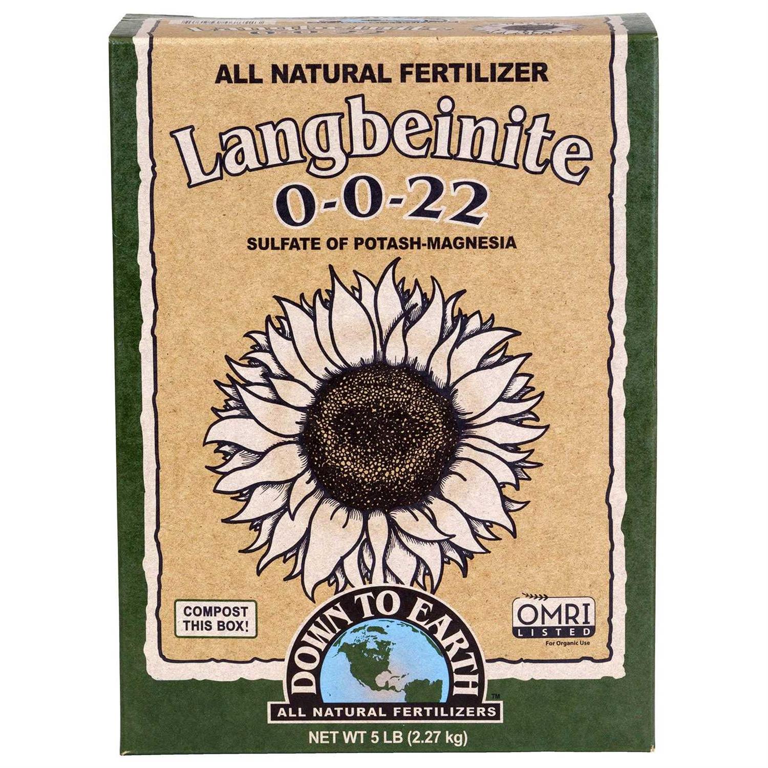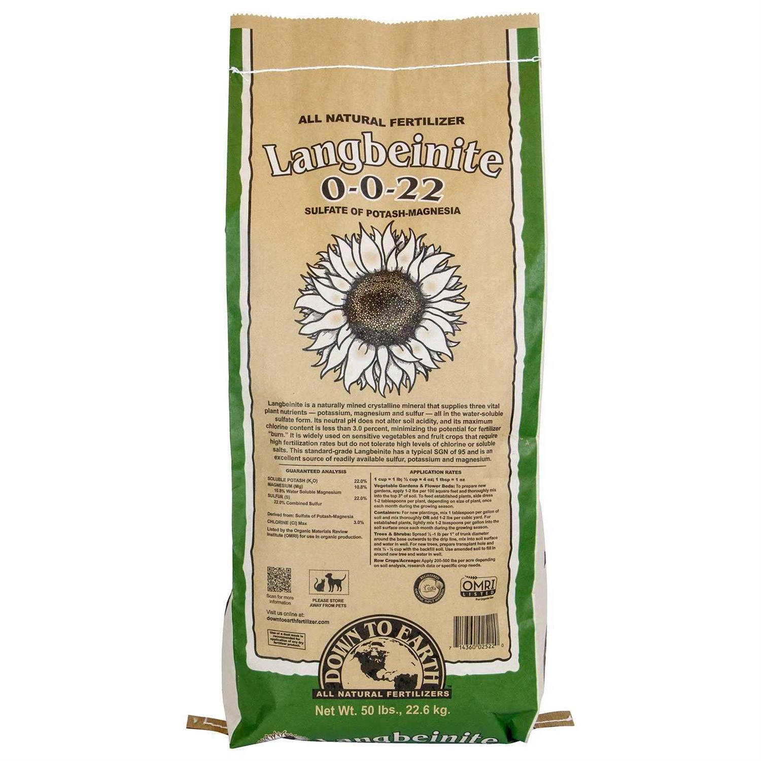 Down To Earths Langbeinite 0-0-22 is a naturally mined crystalline mineral that supplies the water-soluble sulfate form of three vital plant nutrients: potassium, magnesium and sulfurs. Its maximum chlorine content is less than 3.0 percent, minimizing the potential for fertilizer burn, and its neutral pH does not alter soil activity. Potassium contributes strongly to overall plant health by regulating internal processes. Since potassium makes up part of the fluid of the plant, it is found throughout plant tissue, meaning plants need a strong source of potassium as they grow. Potassium deficiencies lead to weak stalks and immature roots, leaving the plant susceptible to insects. DTE Langbeinite 0-0-22 is widely used on sensitive vegetables and fruit crops that require high fertilization rates but do not tolerate high levels of chlorine or soluble salts. This standard grade langbeinite has a typical SGN of 95 and is an excellent source of readily available sulfur, potassium and magnesium.