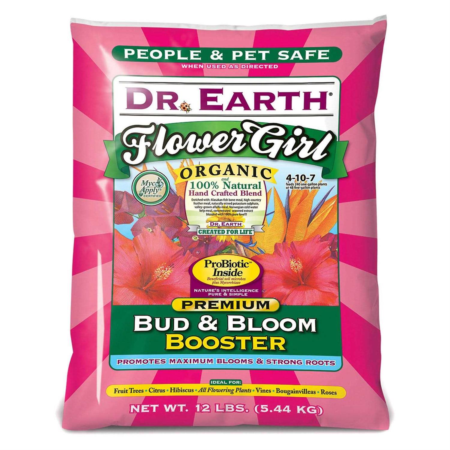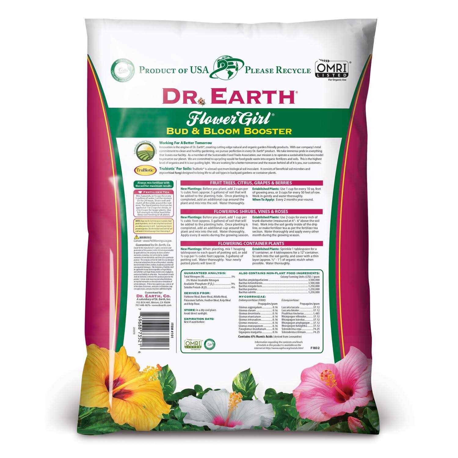 DR EARTH 101 Flower Girl Bud & Bloom Booster 4 10 7 produces remarkable results in your flower garden. Nutrients are quickly released, yet continue to feed for several months. Contains seven champion strains of beneficial soil microbes and eight select strains of ecto and endo mycorrhizae that contribute to drought tolerance. Contains no GMOs, chicken manure or sewage sludge. People and pet safe, 100% organic and natural.