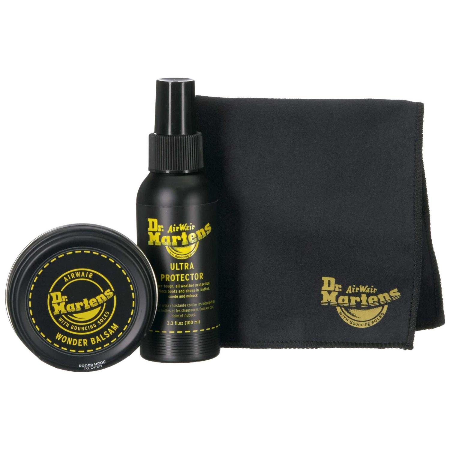 A shoecare kit containing a 50ml canister of Wonder Balsam, a bottle of Ultra Protector spray and a buffing cloth. Wonder Balsam is an exclusive blend of natural and synthetic waxes formulated to nourish, condition and protect leather. Ultra Protector Spray creates an invisible, breathable layer of protection against dirt, rain, UV-rays and stains plus, a handy and soft Dr. Martens-branded buffing cloth that easily removes dirt, marks and residue.