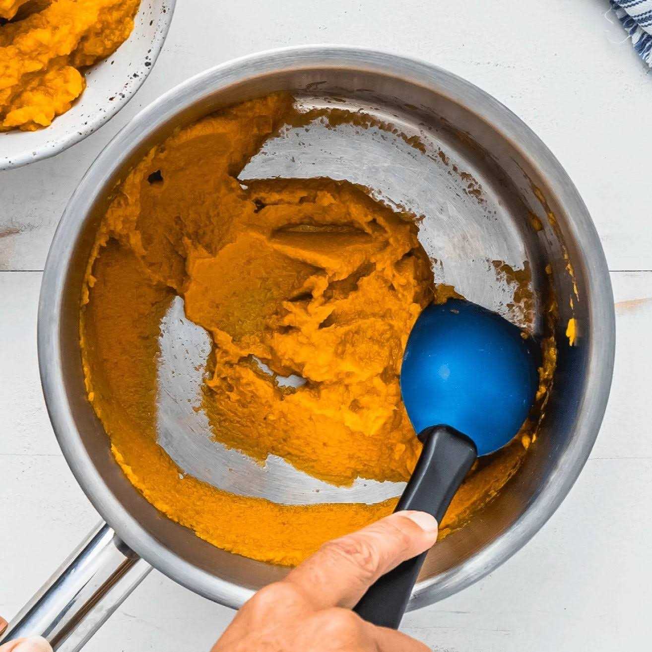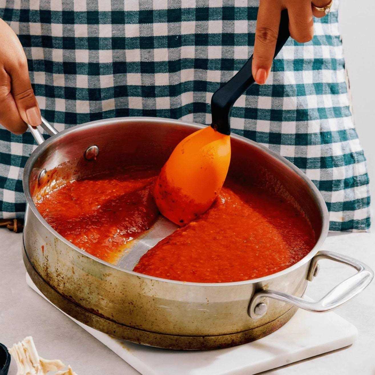 It has a flat squeegee tip and flexible sides to scrape your pan or bowl clean