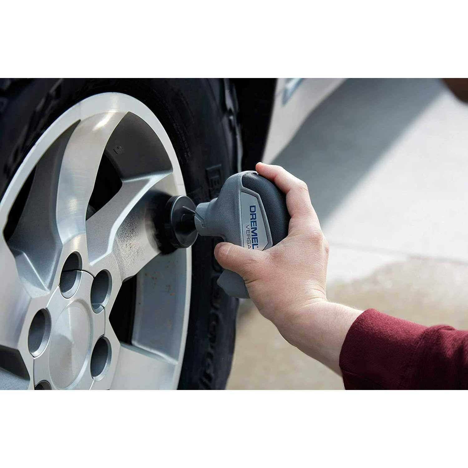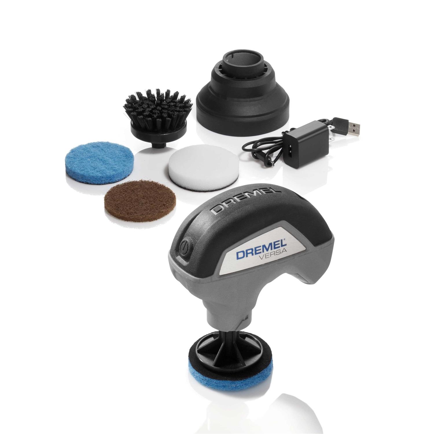 Tough cleaning jobs are a thing of the past with the powerful and versatile Dremel Versa. High-speed scrubbing, in a compact size, is ideal for tackling soap scum, baked on food, difficult grease, dirt and much more. The Lithium-Ion battery charges fast and is perfect for indoor and outdoor, dry and wet uses. The light-weight and compact design is ideal for single hand use and to tackle hard to reach places. Accessories changes are fast with the hook and loop interface. Switch from tile to glass, or upholstery to metal in no time and use the Dremel Versa with or without water and cleaner based on the application.