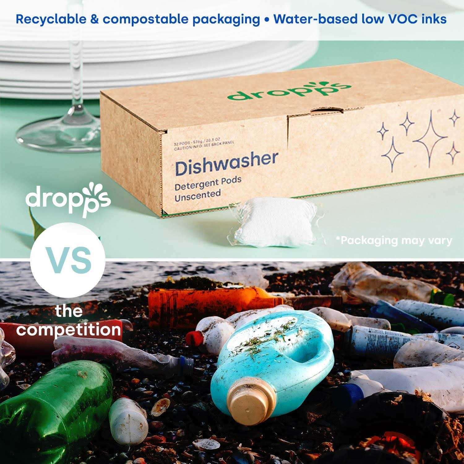 Dropps Dishwasher Detergent pods will dissolve food debris, fight stains and make your dishes, glassware and silverware sparkle like new. Our natural detergent pods are biodegradable and environmentally-friendly, yet formulated to cut through the toughest grease and food particles. The pre-measured pods dissolve completely to remove stuck-on food and tough stains. The gentle scrub eliminates residue and protects glasses (even safe for fine crystal) from etching and leaves your glassware streak less and dishware smelling fresh and clean. Dropps Dishwasher Detergent pods are pre-measured and 100% mess-free. All you have to do is load in your dishes and glasses, place 1 Dropps dishwasher detergent pod in the detergent dispenser and start your machine. Our scented dishwasher pods are safe for septic tanks and compatible with all dishwashers – even European and small apartment models. Our hypoallergenic, non-toxic, and non-irritating dish detergent will even clean your dishwasher, leaving it mildew-free.