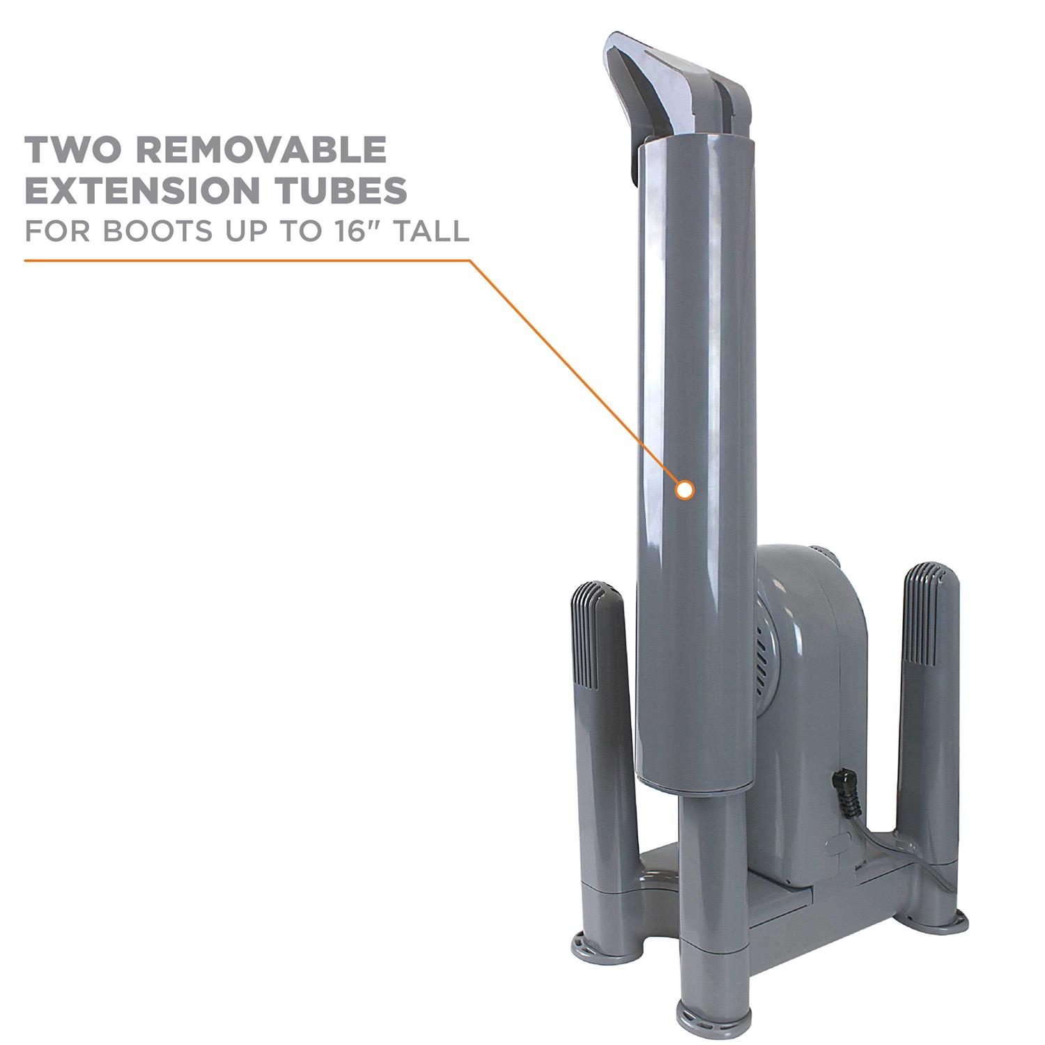The DryGuy Force Dry DX – Boot and Glove Dryer can dry two pairs of boots, shoes, or gloves in 1 to 2 hours. From rain soaked soccer cleats to sweaty ski or hunting boots to soggy gloves filled with melting snow, the DryGuy Force Dry DX dries a variety of garments so you can start the day with dry, comfortable hands and feet. The Force Dry utilizes gentle forced air and 105-degree heat to quickly remove moisture and help prevent the growth of fungus and bacteria that cause odors and deteriorates footwear over time. It includes two removable extension tubes for drying boots up to 16 inches tall. It is completely safe to use and will not shrink, warp, or otherwise harm delicate garments and custom fit liners. The DryGuy Force Dry DX comes with a 1 year manufacturer’s warranty.