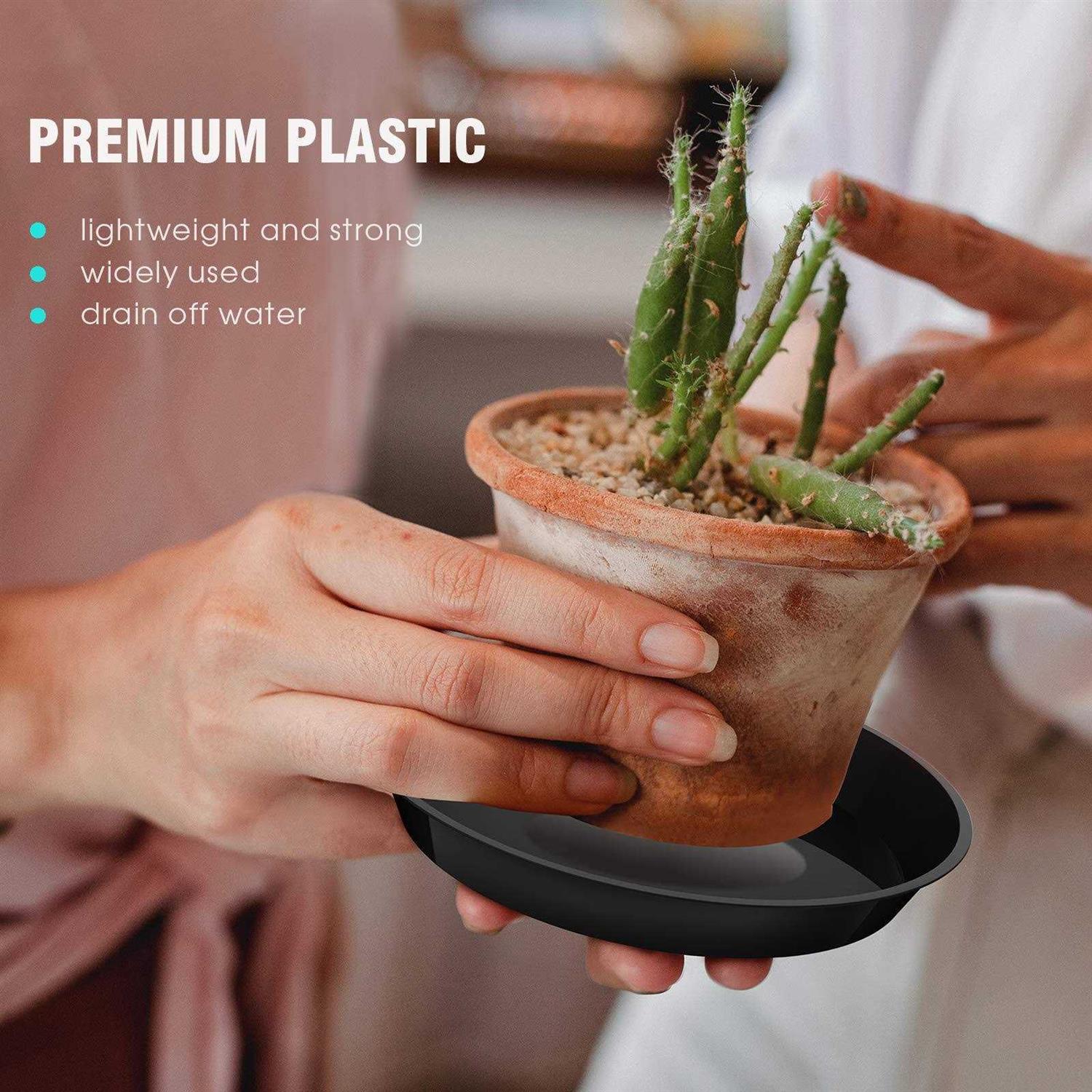 【6 Pcs 6 Inch Plant Saucers】The top of this plant tray is 6.2 inches and the bottom is 5.1 inches. Please choose the correct pallet size, which will better match your flower pot. 【Optimal Plant Drainage】These plant saucers can help you get water from the drainage holes of the flower pots, which can avoid excessive watering, and create a good soil environment for plant growth 【Sturdy Material】The plant saucers are made of high-quality PP material, which is durable and can withstand heavy flower pots. You don’t need to replace this plant tray frequently, which will save you some expenses. 【Leak-proof Design】Suitable tray height, ideal drainage tray, collect excessive drainage and soil spills, help protect wooden floors, carpets and desktops, which can provide a good guarantee for the growth of your beautiful plants and flowers 【Widely Use】These plant trays are not only suitable for gardening, but also very suitable for home decoration. You can decorate them with colorful pebbles, and can also be used to hold fruits and other small objects. BPA-free recyclable materials, safe and environmentally friendly, can be reused. The benefits of plant saucers, and why you need a plant saucer. /b br br br 1. PROTECT THE PATIO /b br br If a patio is damaged, it can cost a large amount of money to fix or replace it. So a pot saucer is a cheap and effective way to keep from ruining a patio or anything on it. br br 2. COLLECT DRAINAGE /b br br Plants need proper drainage to remain healthy and live a long life, and while a saucer isn’t always required for drainage, it can help. However, using a saucer means it is not necessary to worry about excess water. It can flow normally, and the saucer will catch it so that the water doesn’t go all over. br br 3. KEEP PLANTS HYDRATED /b br br By using a pot saucer, plants can be watered regularly without fear of the water flowing onto the table or patio. EASIER TO MOVE /b br br When plants need to be moved for any reason, having them on something can be helpful. It is not necessary to worry about soil falling out of the bottom or otherwise creating a mess because the saucer will catch it. It can even make it easier to move plants to other places that you want. br br NOTICE /b : br 1. Once you’ve finished watering, give it a few minutes to fully drain then tip away the water that’s collected in the saucer. Doing this will prevent your plant from suffering from any problems. br br 2. If the flower pots are irregular shape, what do you do thenpretty rocks, glass, or marble. You can use beautiful rocks, glass or marble on the tray and place the flower pot on top. br br 3.