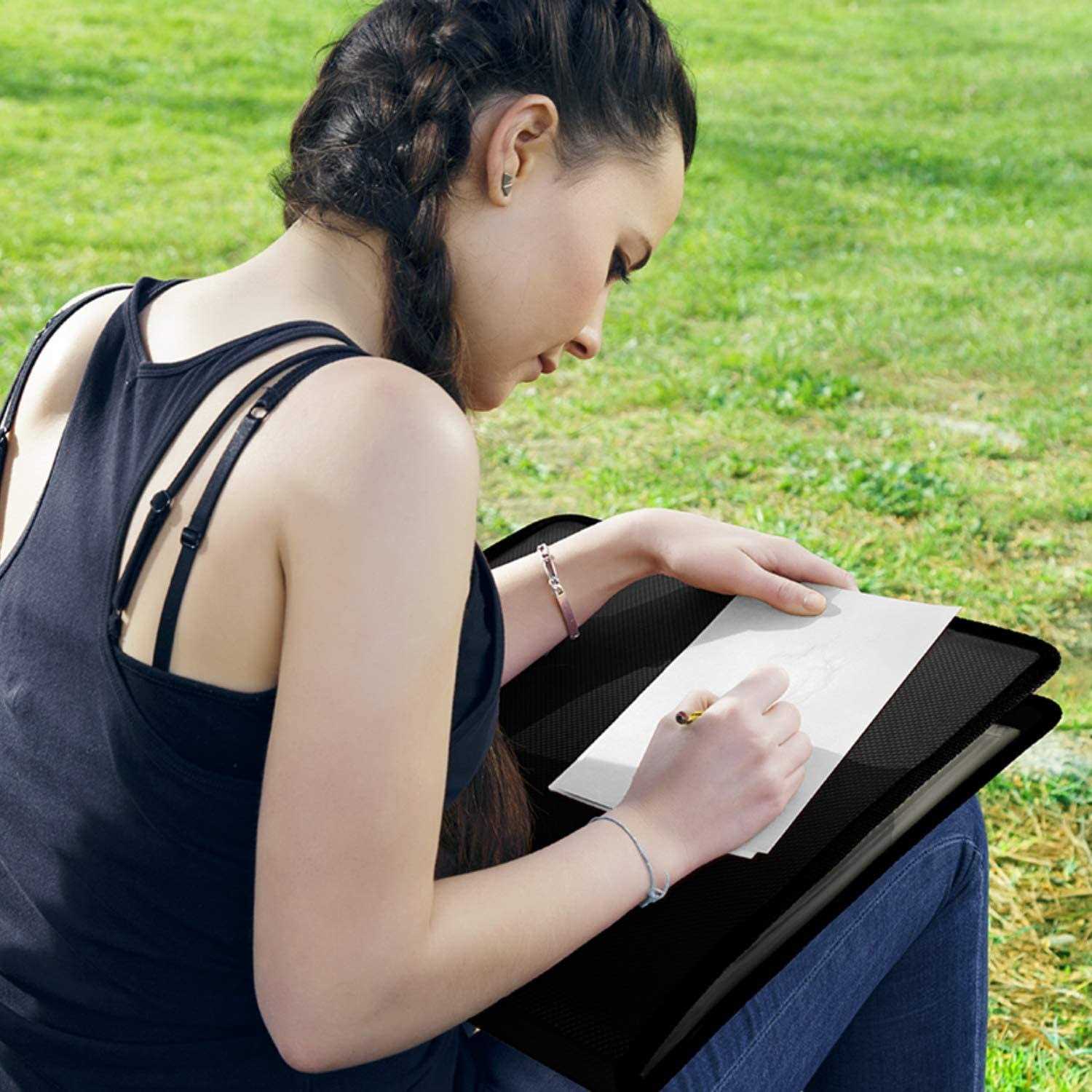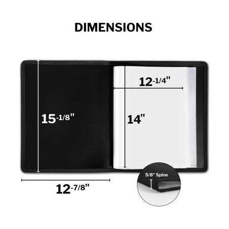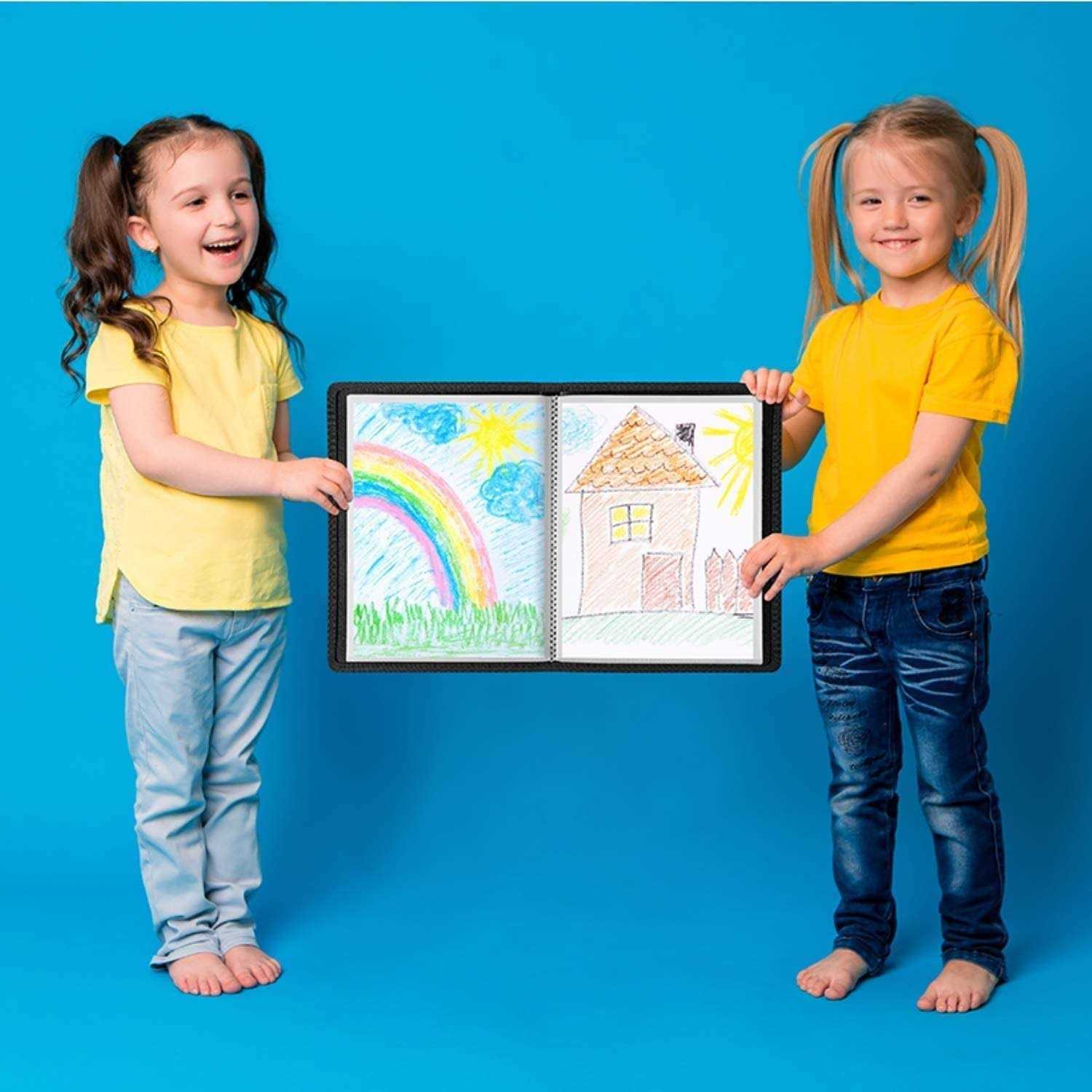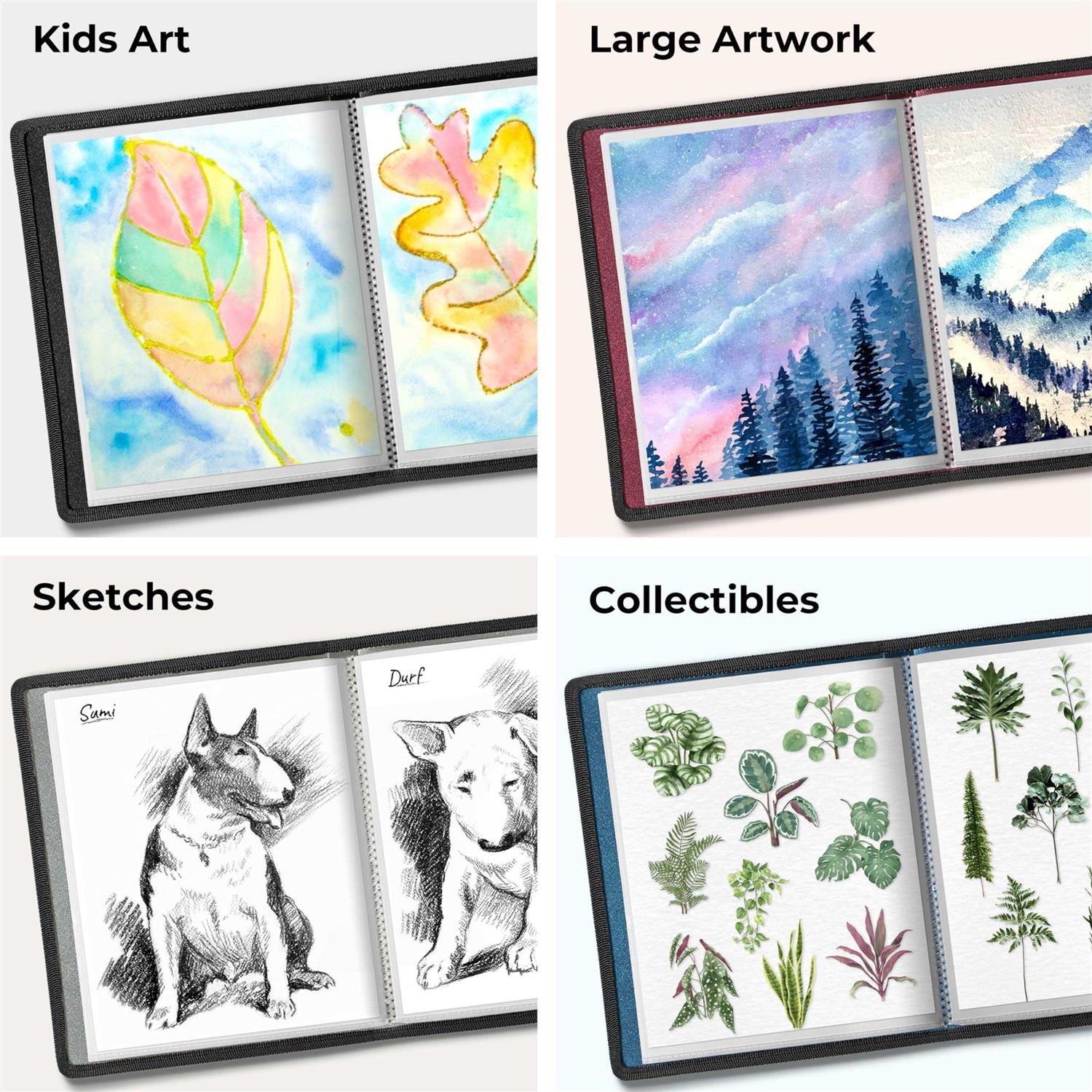 11×14 Art Presentation Book: Displays paintings, photos, art pieces, drawings and sketches. Large artist portfolio provides storage protection for souvenir posters, illustrations, Lies flat when open. Includes: 1 Black cover large portfolio folder for art. Great for artist, collector, art student, teachers, kids, small business owners to present their portfolio art, photo portfolio. Looks Great: Art portfolio book cover is constructed of sturdy yet flexible poly plastic with an attractive textured look and feel, finished with an elegant woven black trim. Portable, cleanable. Quality Plastic Binder Sleeves: Standard weight clear poly pockets are archival quality, non-glare, non-cling, no ink lift-off. Art binder provides artwork storage for drawing portfolio, watercolors. 24 Sleeves: 11×14 Album has 24 bound (non-refillable) top-loading plastic sheet protectors, Displays 48 viewable pages of 11 x 14 artwork, sketches, etc.