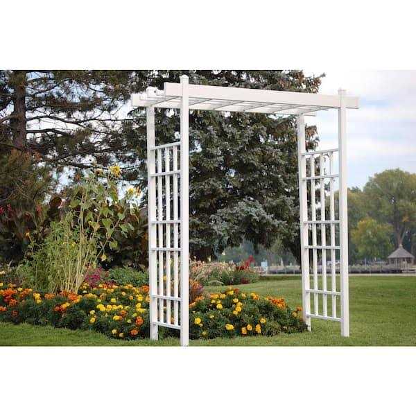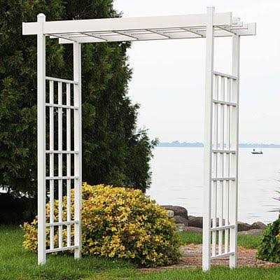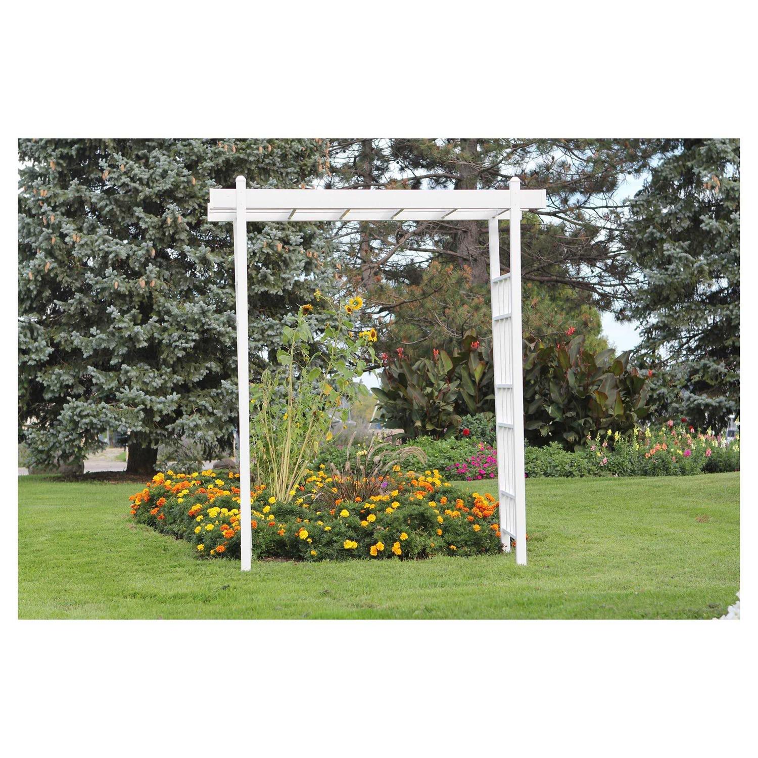 Put the classicDuraTrel Bakersfield 72 inchx 85 inch White Vinyl Arbor at the entrance to your garden and your guests will be welcomed in style. The sides and top of this arbor boast grid frameworks that encourage climbing vines and flowers to flourish. The weather-resistant and maintenance-free PVC vinyl ensures years of enjoyment without the worry of fading or the hassle of painting. The pre-drilled holes make for easy assembly and the included ground anchors provide stability.