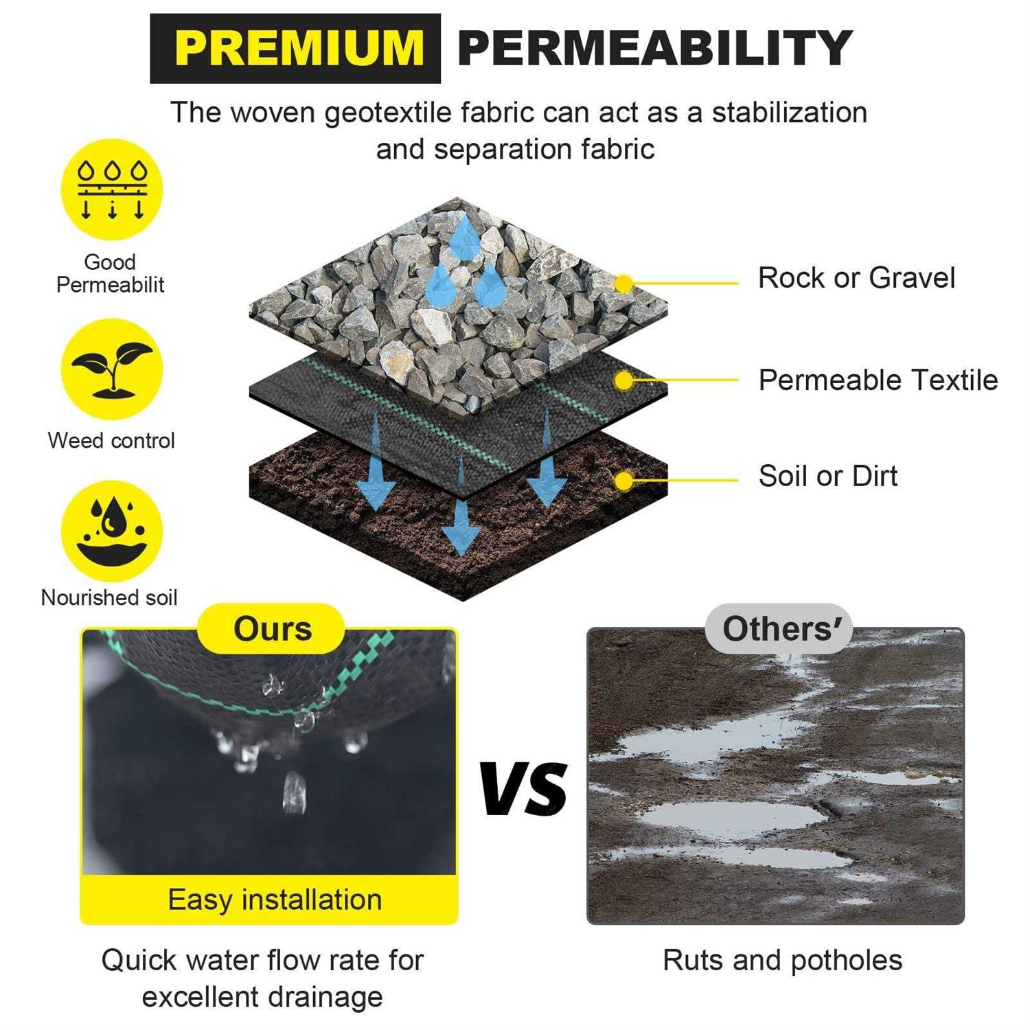 【2.4OZ Driveway Fabric】 :Our 2.4 Ounce Heavy Duty Geotextile made from High-Quality Polyethylene Material,tear-resistant and against UV radiation is tough and durable 【Large Geotextile Fabric】- Our commercial-grade driveway fabric is Length: 300FT,Wide:6FT, 2.4oz,Note: This product is 6FT and the folding package is 3FT width 【Excellent Permeable Textile】- The woven geotextile fabric is highly permeable and breathable, without worries about water pooling. It is ideal for french drains, garden planting, and landscaping,to provide convenience on the driveways 【Safety and Sturdiness】-800 LBS Tensile Strength,The underlayment fabric is high-strength and stretchable with a large weight capacity. Will last many years and stands up to the toughest conditions,You can lay gravel, stones, big rocks on it to increase the stability and flatness of the road and prolong its service life. 【Wide Applications 】-Can be used for many different projects including Landscaping, geotextile fabric is perfect for construction projects, Erosion Control,such as road stabilization, riprap, retaining walls, animal stables, patio landscaping, etc 800 LBS Tensile Strength,The underlayment fabric is high-strength and stretchable with a large weight capacity. Will last many years and stands up to the toughest conditions,You can lay gravel, stones, big rocks on it to increase the stability and flatness of the road and prolong its service life.