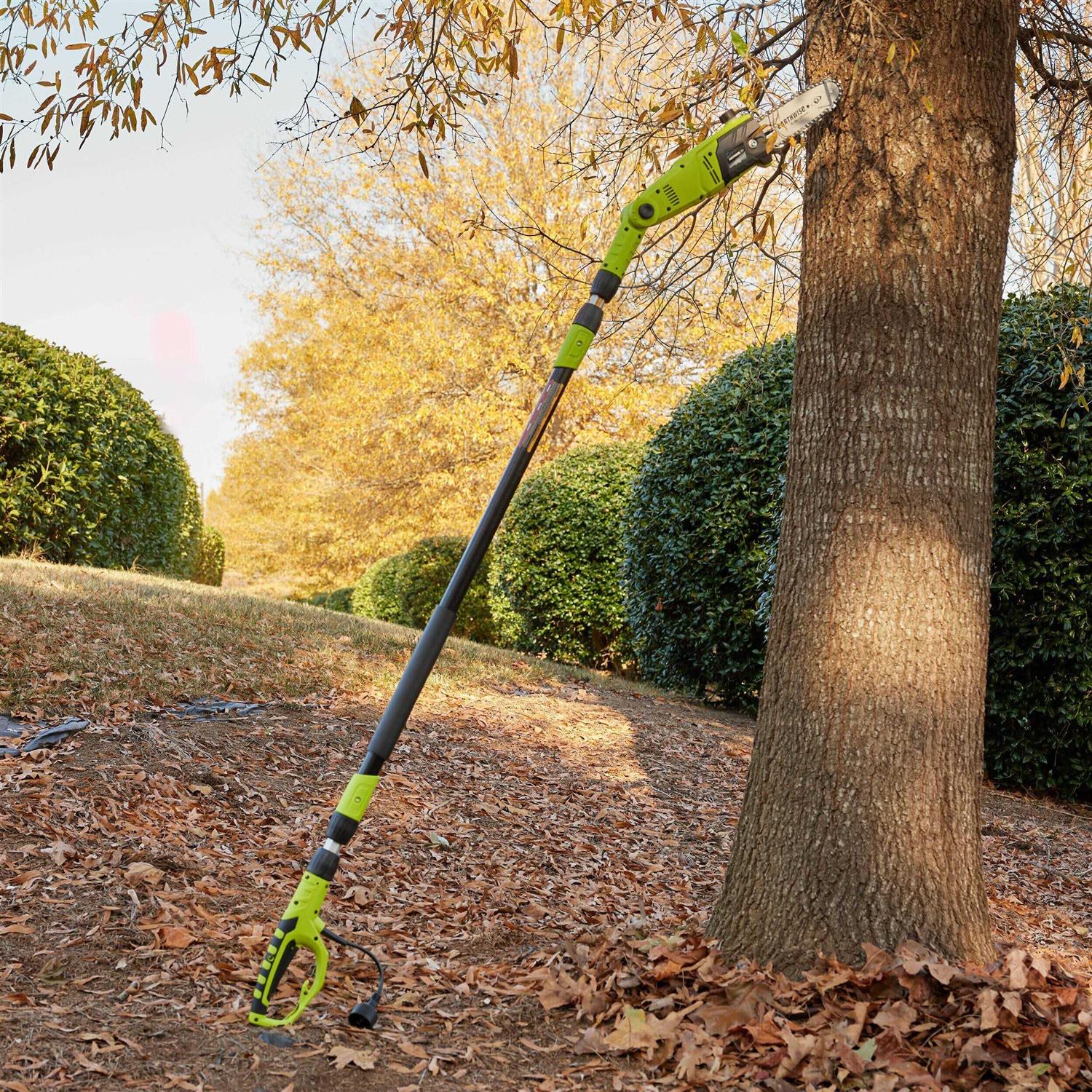 Earthwise electric corded pole saw takes trimming tree branches and hard-to-reach brush to the next level. At fully extended length this telescoping corded electric pole saw reaches, making this pole saw one of the longest pole saws available. The powerful 6.5 amp motor makes for quick, clean cuts while you stand safely on the ground. With the extended reach and power. This corded electric pole saw offers everything you need for trimming branches and limbs around the house. This corded electric pole saw features an automatic oiler system, oil level window, Adjustable cutting head and comfortable grips. Take the hassle out of your fall home and yd clean-up with this corded electric telescoping pole saw.