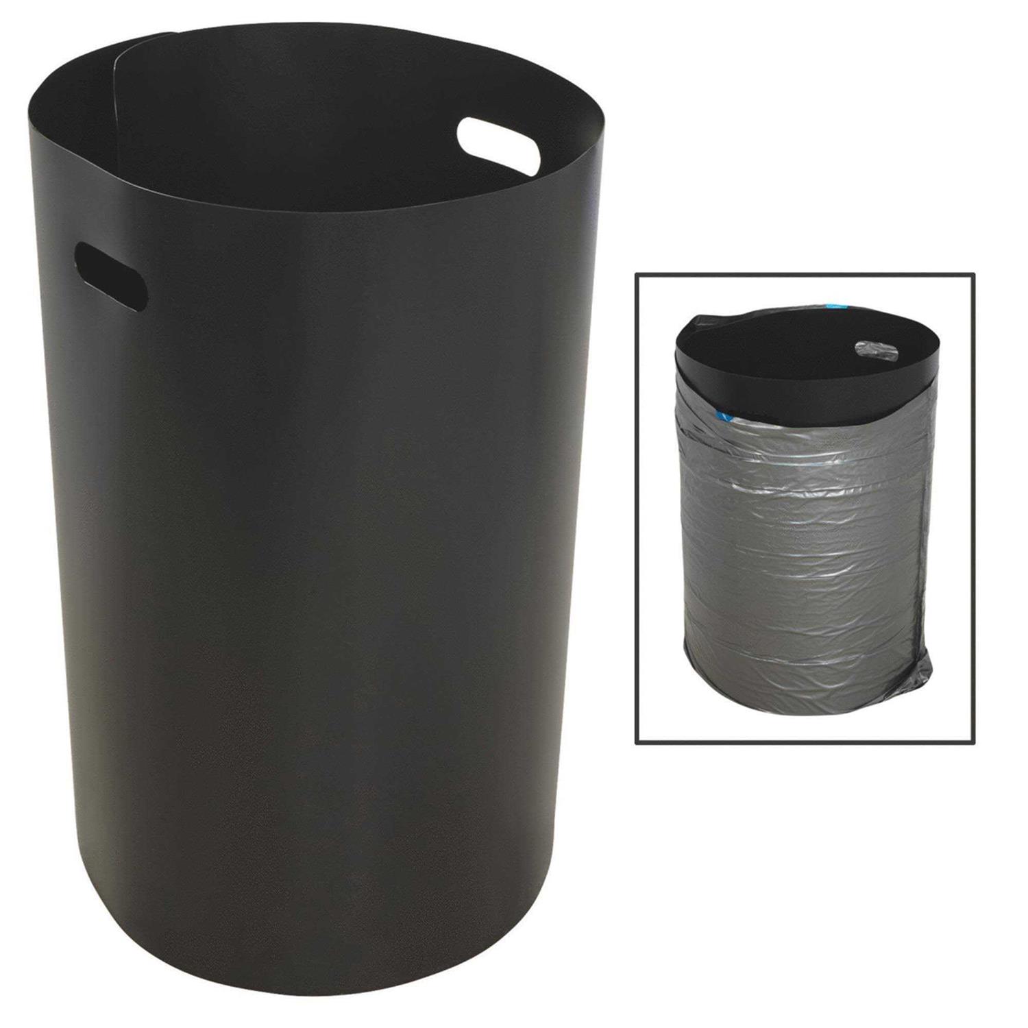 Sturdy, reusable plastic liner. Frees both hands, rolls up for easy storage and prevents puncture when filling. Use with all popular size trash, grass, and leaf bags. 30” high. Black with die cast handles. Manufacturer No. 500 UPC, 016104005001. Holds 30 to 39 gal. bags (not included) Rolls up to 28” x 4-3/4” Reusable Black plastic with ”D” cut handles Polybagged.