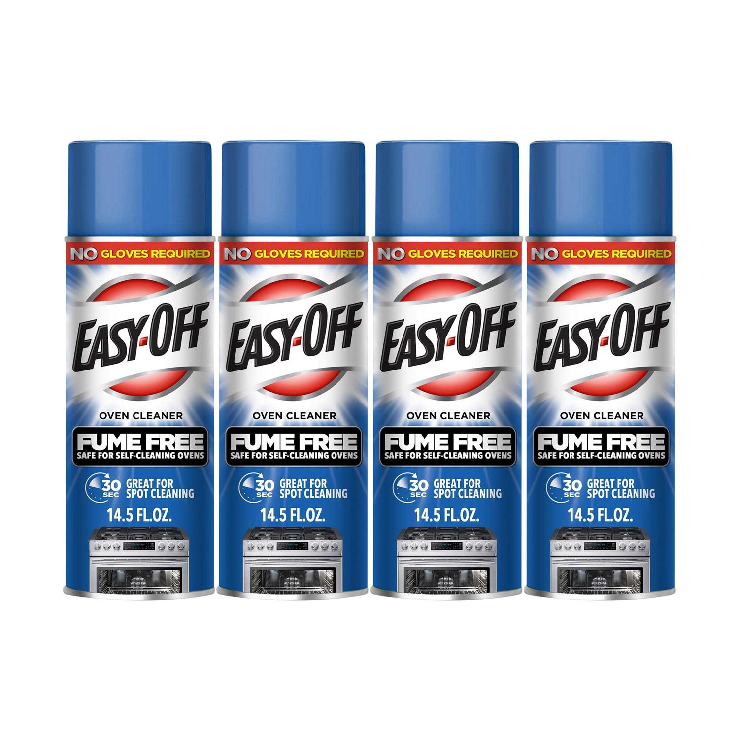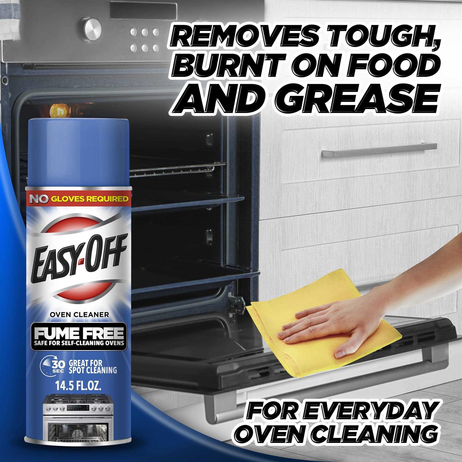 Cleans tough baked-on ovens grease & spills with no fumes Safe for self-cleaning ovens, just spray on the stain and wipe away Use to clean ovens, oven doors, broilers, broiler pans, and stainless steel surfaces Product of Easy-Off EASY-OFF Fume Free Oven Cleaner cleans tough baked-on ovens grease & spills with no fumes. Tough spills are removed in seconds! It’s perfect for spot-cleaning and everyday use. Safe for self-cleaning ovens, just spray on the stain and wipe away! No gloves required! Use to clean ovens, oven doors, broilers, broiler pans, and stainless steel surfaces. Cook with passion. Clean with Easy-off!