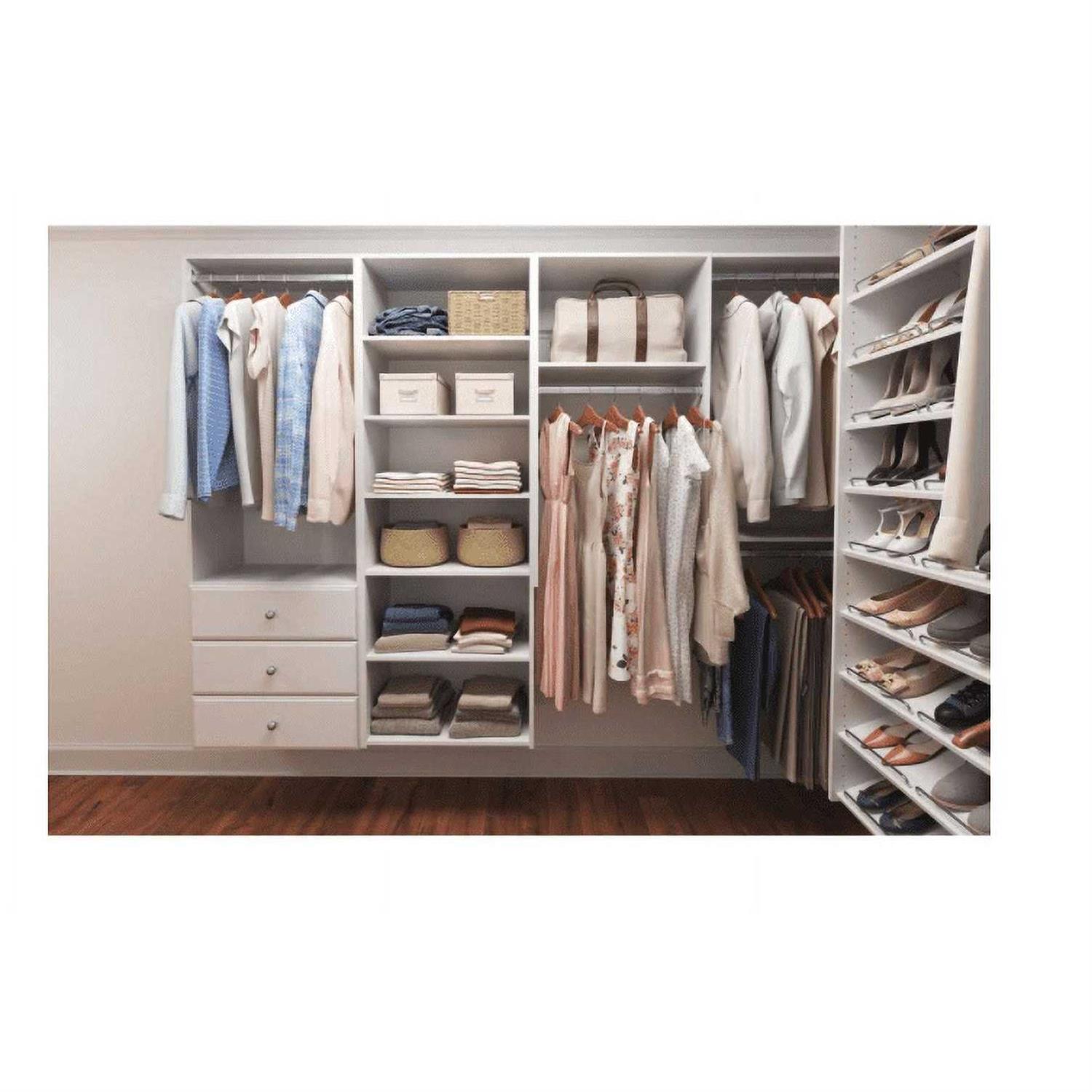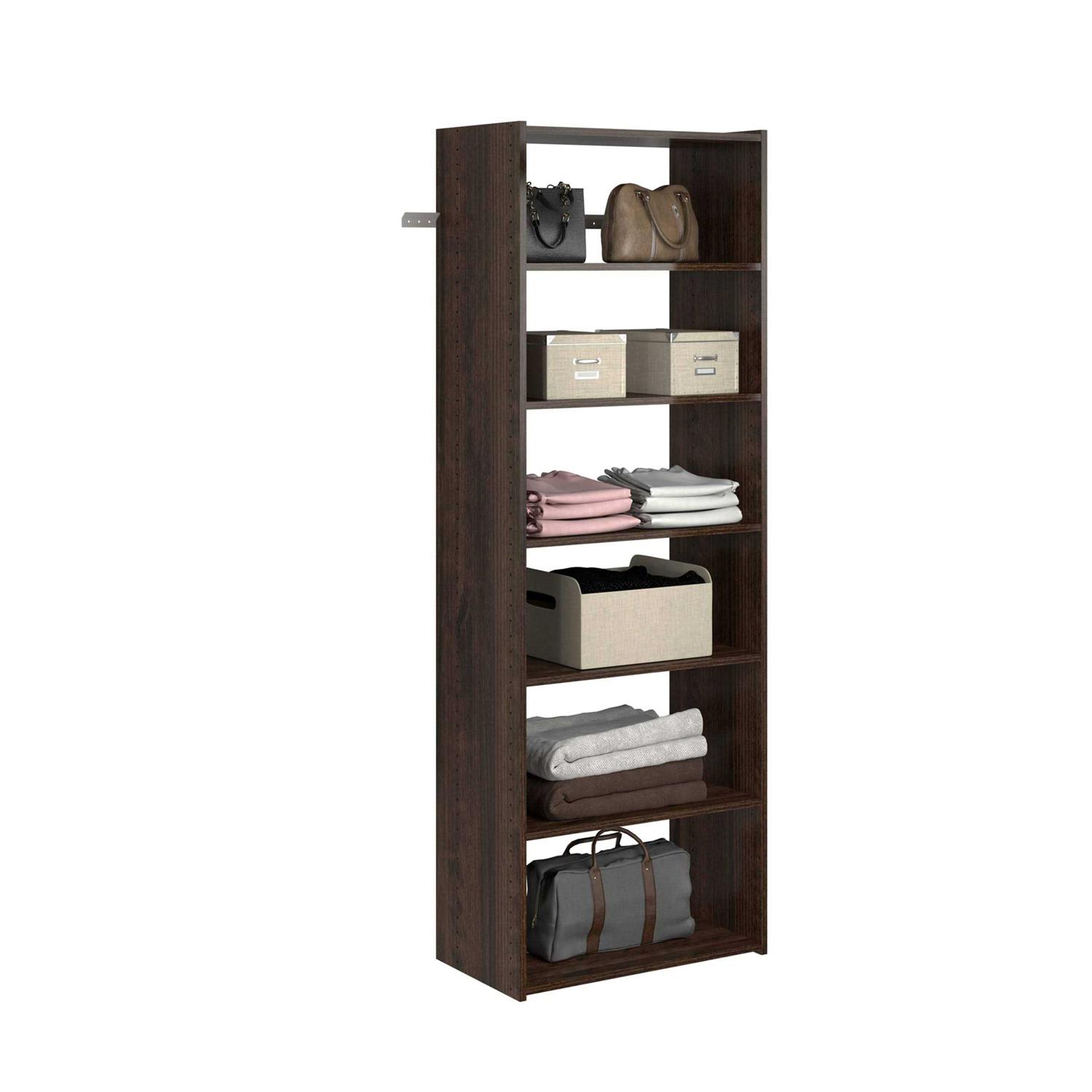 Get organized with the easy to install essentials shelf tower kit. This 72 In. tower includes seven shelves providing 14 Ft. of open shelf space. Need a product for any room Add this shelving tower to a bedroom closet entryway laundry room office or even the garage. This closet tower can be cut to fit your desired width and hangs on a wall mounted steel rail for an easy installation. Each kit can be installed on its own or combined with other closet kits and comes with all of the required installation hardware.