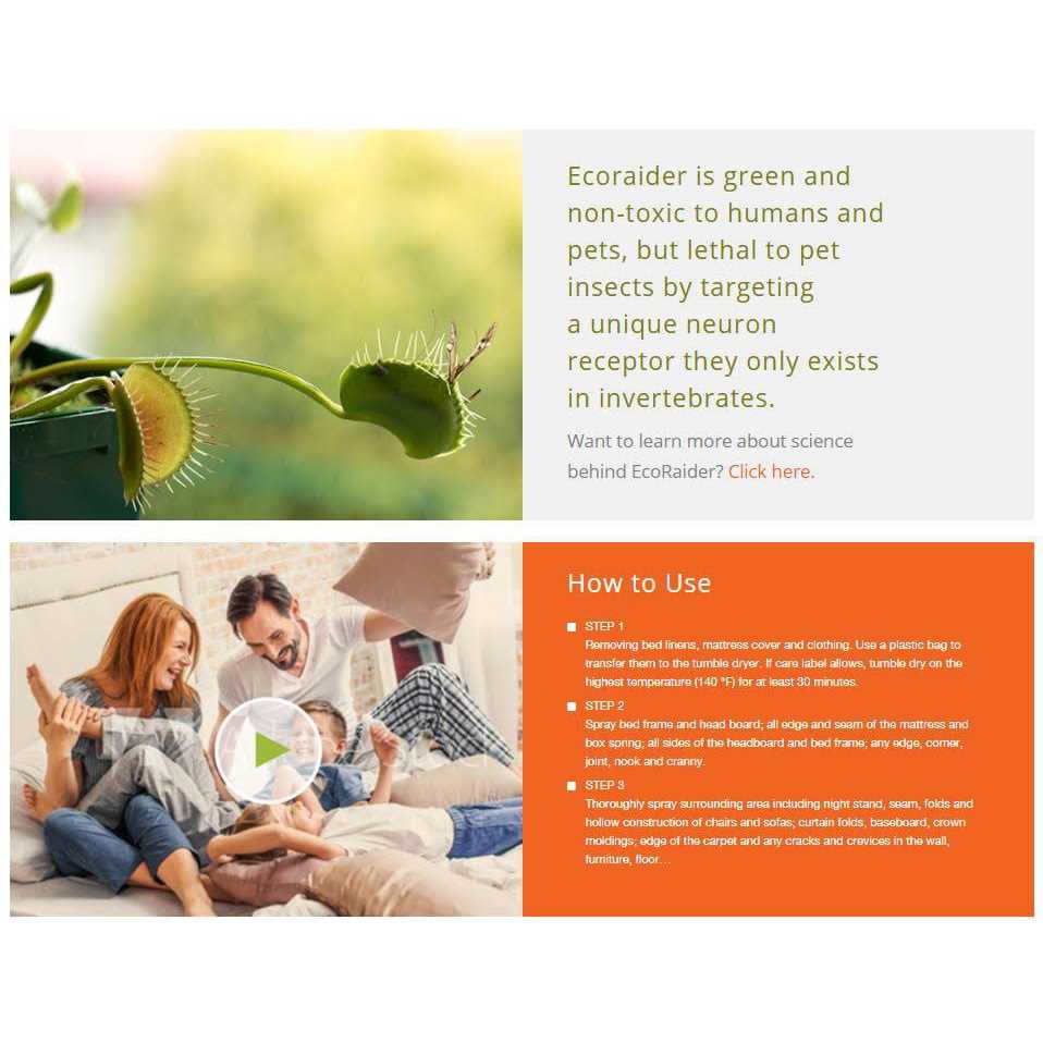 EcoRaider kills bed bug adults and eggs fast and provides extended protection after treatment. It does not compromise on super bugs that have developed resistance against conventional pesticides. It provides a complete solution for bed bug eradication that is green and safe. EcoRaider is not a pesticide. It is a botanical-based safe insect killer that kills tough pests including bed bugs like you have never experienced before. It is easy to use, lethal to insects, but safe for children and pets. It has become the #1 tool preferred by leading pest management professionals and recommended by the USDS IR4 Public Health Pesticide Program for treating bed bugs in public housing facilities. According to a university independent study published in the Journal of Economic Entomology, after testing a dozen of bed bug products, EcoRaider was the only product that kills 100% of bed bugs. In the same study, EcoRaider also was the most effective among all products in killing bed bug eggs. EcoRaider not only kills bed bug fast and thoroughly on contact, it provides an extended residual for two weeks. Unlike chemical pesticides, EcoRaider kills insects through a unique mode of action. EcoRaider’s plant extracted active ingredients attack a neuron receptor that only exists in invertebrates (such as insects) to cause immediate paralysis and death, but do not affect vertebrates (such as humans, birds, animals and fish). EcoRaider only contains ingredients that are generally recognized as safe. According to Product Safety Lab testing, EcoRaider causes none to minimal skin irritation. It is safe for people, for pets and the whole household. EcoRaider can be used in sensitive environments such as schools, clinics, health-care facilities and public areas.