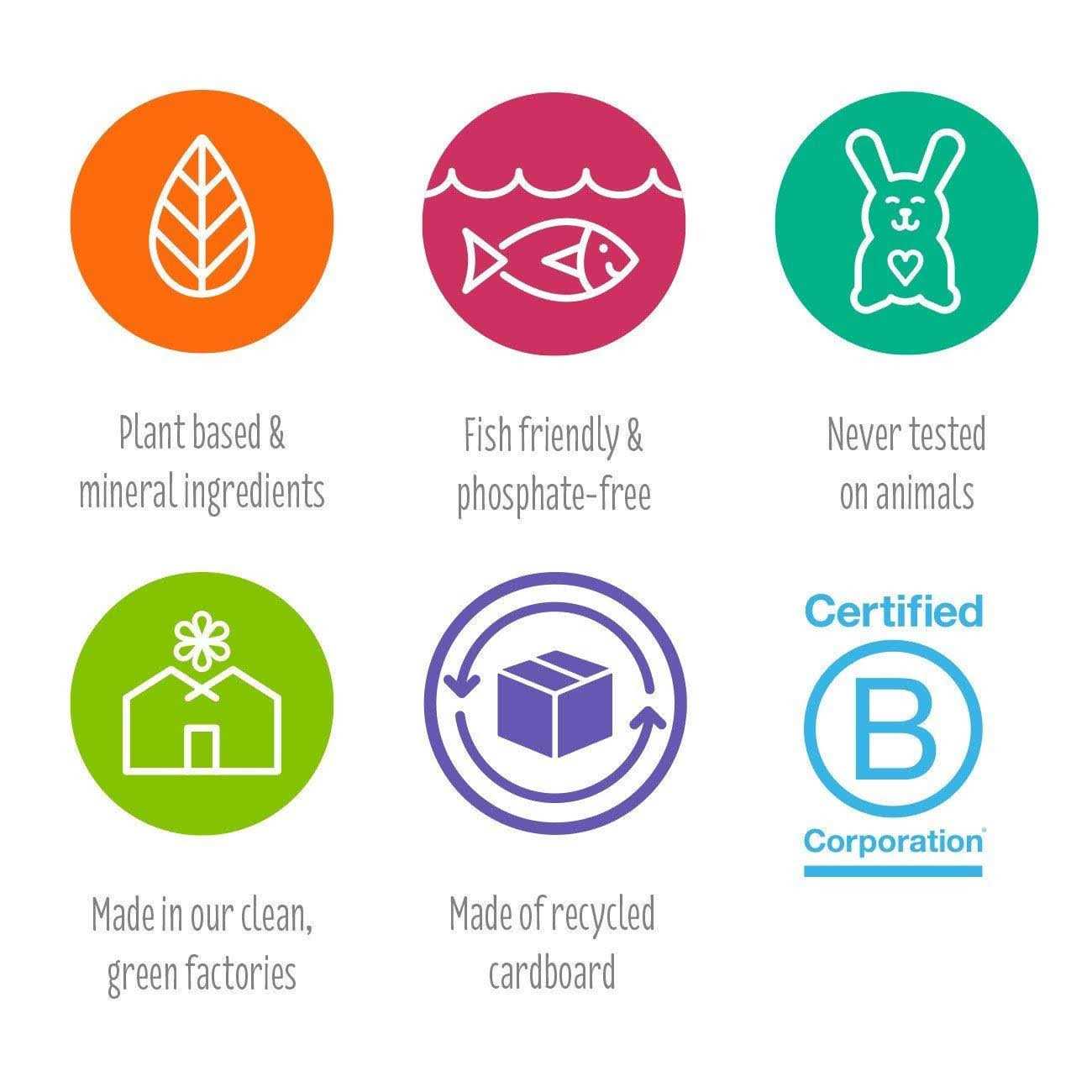 Powers away stuck-on food & gets dishes sparkling clean. Biodegradable and phosphate-free. Naturally derived fragrance. Made using plant-based and mineral ingredients. Never tested on animals. Box made from recycled cardboard.