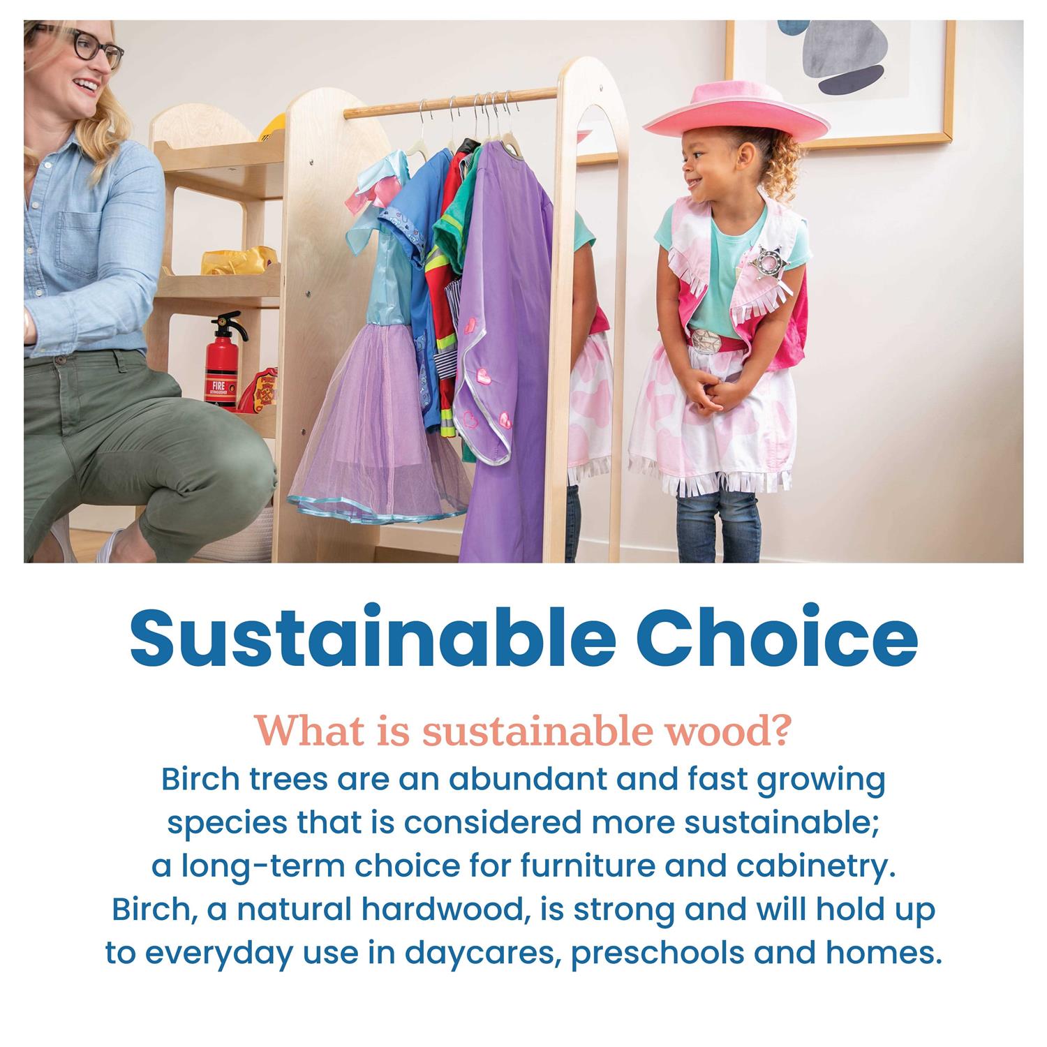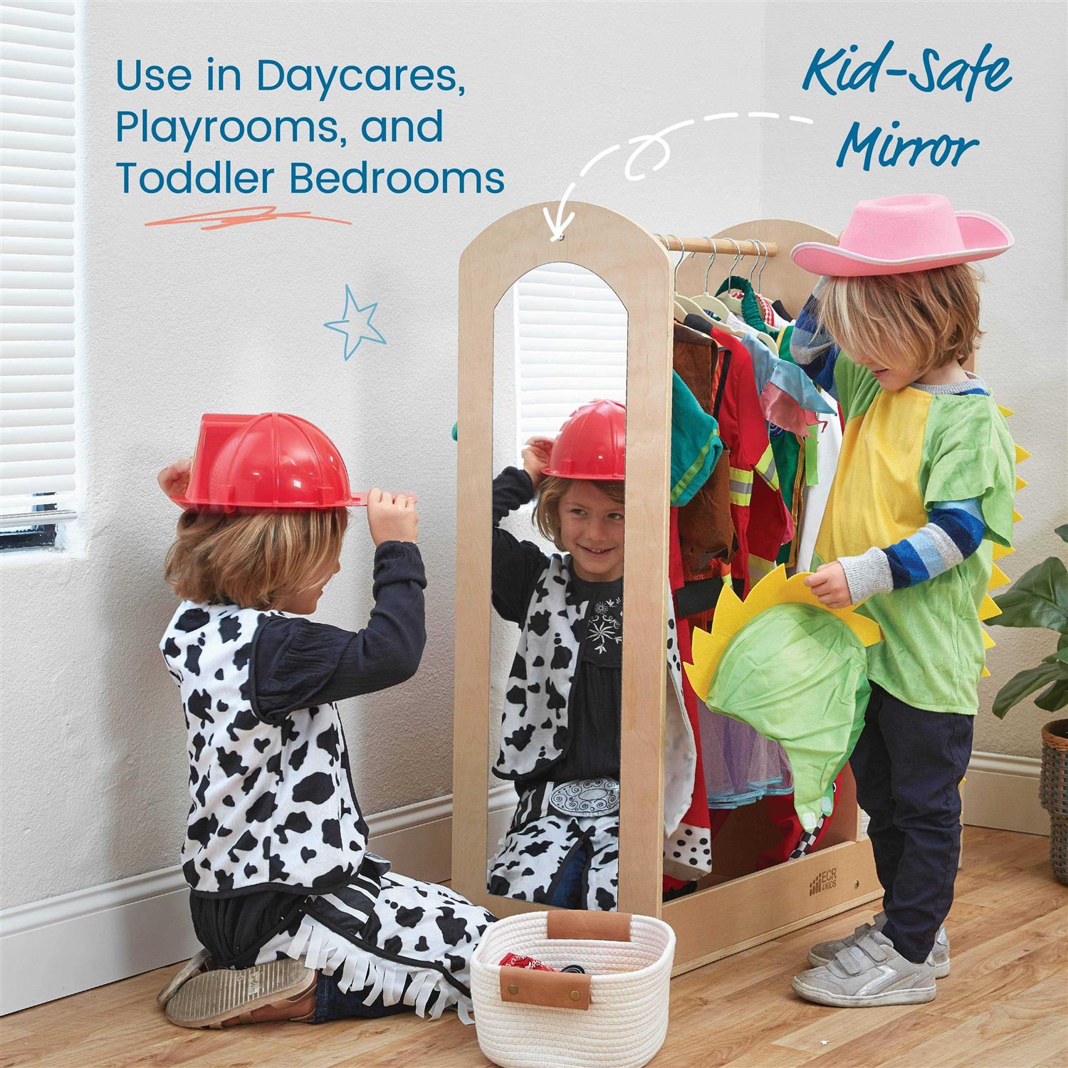 The ECR4Kids Dress Up Center is the perfect place to store and organize clothing, costumes, and shoes. Little ones build confidence and develop language, social skills, and self-expression through imaginative play. The multipurpose wardrobe keeps outfits, apparel, and accessories organized with display shelves and cubbies that feature a perimeter edge to prevent small items from rolling out. The children’s wardrobe storage features a garment rod, four-shelf compartments, and a built-in shatter-proof safety mirror. The 360° design allows multiple children to play at once selecting their own outfits and dressing themselves independently. Display seasonal clothing in the bedroom to provide options and encourage children to pick their own outfits and dress themselves. Use in a playroom or classroom as a kid-sized costume closet for dress-up and imaginative playtime. Constructed from sustainably harvested birch plywood with a tough UV lacquer that seals the wood surface and resists scratching. A UV inhibitor makes furniture resistant to ultraviolet light and yellowing. Natural birch plywood is extremely durable and will hold up to everyday use in daycares and preschools. The natural grain complements any space. Pair with other ECR4Kids Birch items to complete a Montessori learning space, sold separately.