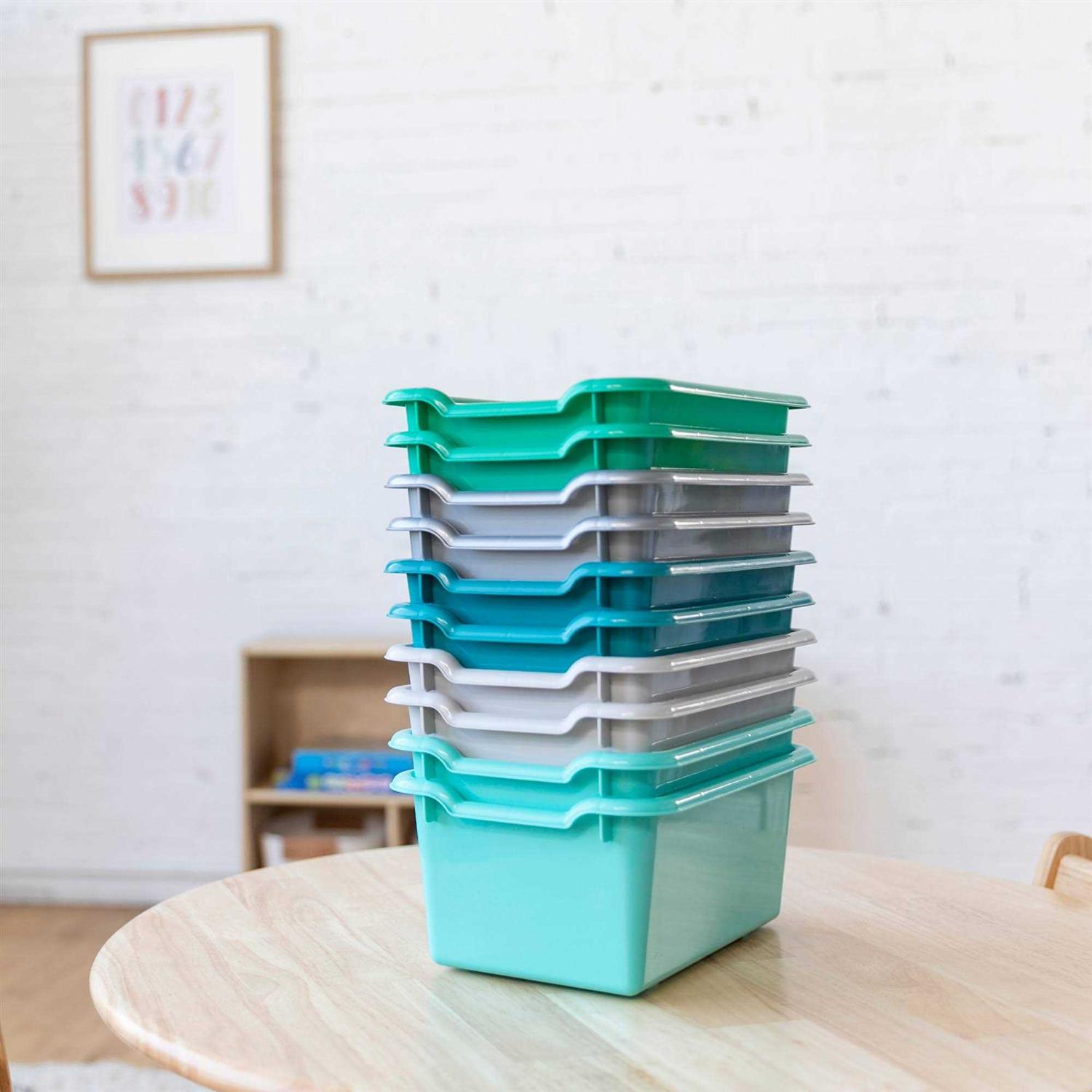 Keep your classroom and home organized, tidy, and efficient with ECR4Kids Scoop Front Storage Bins. The sturdy plastic bins are designed for everyday use to keep small items contained off the floor. Teachers, educators, and parents can utilize bins to store books, toys, manipulatives, and games. The open bin design displays and provides easy access to contents. Organize stories and label bins by reading level, theme, or holiday, encouraging children to independently select their favorite story and clean up during playtime. Personalize trays in classroom cubbies for children to store art projects, individual items, homework, and more. The Scoop Front Bins provide a flexible storage solution with endless possibilities for use from the garage to the kitchen pantry, or nursery. Durable plastic bins feature rounded edges, an easy-to-grasp scoop front handle, and a curved interior to simply remove contents. Lightweight bins are easy to pick up and carry, transporting from a storage cabinet to a play space. Bins nest to save space, and built-in stack supports prevent locking when empty. Use as standalone storage or pair with ECR4Kids storage lockers, cubby units, or tray cabinets; sold separately.