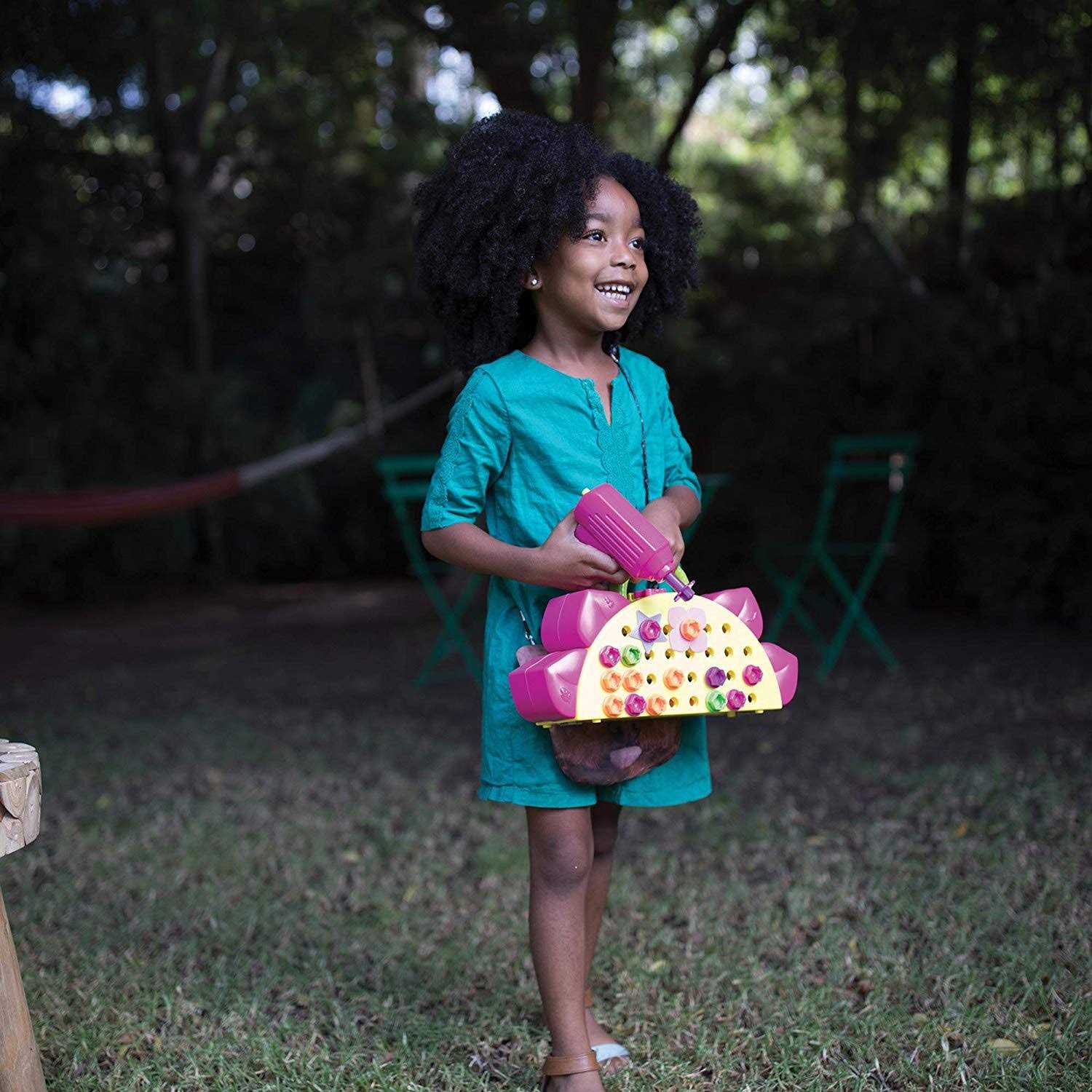 Brilliance blossoms with this colorful design studio! Arrange and drill the designer plates and bolts into gorgeous, garden-worthy patterns and designs. When it’s time to pack up the fun, everything fits neatly into the fold-up board for no-mess creativity–and learning–on the go! Recommended for ages 3 years and older. Includes fold-up flower board (doubles as carrying case!), power drill, 60 bolts in 5 fun colors, 6 designer plates, butterfly clasp, Phillips bit, flower bit, and guide with 12 patterns. Real kid-friendly power-tool action for hours of flower-powered fun. Multilingual package and instructions in English, Spanish, French, and German. Multilingual package and instructions in English, Spanish, French, and German.