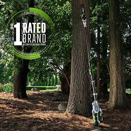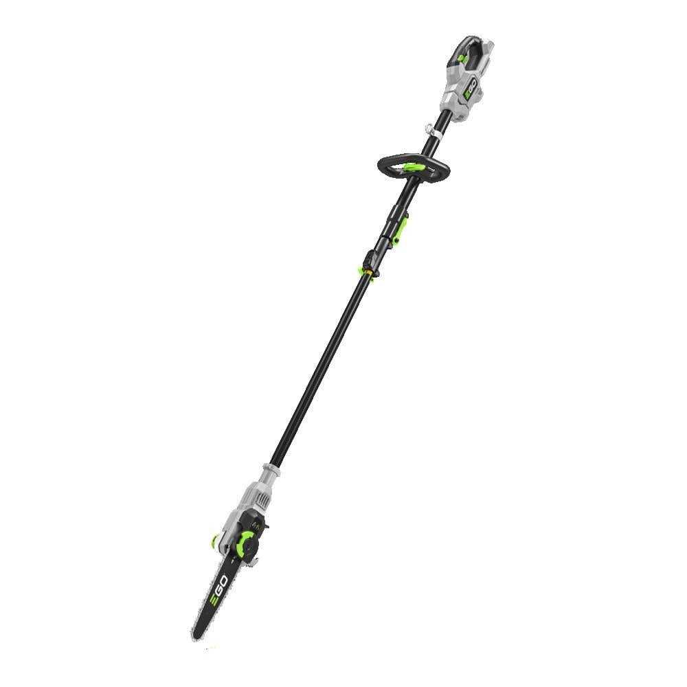 The EGO POWER+ 10 Pole Saw introduces an industry-first LED Cut Line Indicator for improved visibility and better accuracy when working under dark, shaded canopies and low light conditions. Its telescopic carbon fiber shaft extends for a total reach up to 16 feet while maintaining best-in-class weight up to 30 percent lighter than other pole saws for tree trimming. Tool-free tensioning provides fast, precise chain tensioning so you can get back to work faster. This cordless pole saw makes up to 100 cuts on a single charge with the recommended 56V 2.5Ah ARC Lithium battery (available separately). The electric pole saw features a high-efficiency brushless motor that delivers long runtimes, low vibrations, and an extended motor life. Its 10-inch bar and -inch chain delivers smooth, precise cuts with chain speeds up to 20 m/s. The pole saw features a quick-adjust handle for ultimate control along with a shoulder strap and strap hook for added comfort.