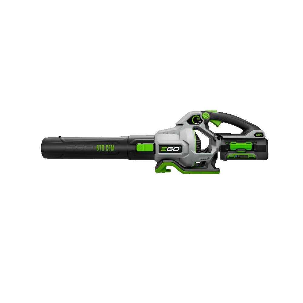 The EGO POWER+ 670 CFM Blower delivers air speeds up to 180 MPH and 670 CFM to power through wet leaves, caked on grass, rocks, and other heavy debris. This cordless leaf blower delivers up to 80 minutes of runtime on a single charge with the included 56V 4.0Ah ARC Lithium battery. Its speed control dial allows you to adjust your airspeed from 250 to 530 CFM for ultimate control. Activate turbo mode to power through heavy debris with 670 CFM and 21N push force. The variable speed trigger includes a cruise control dial for consistent blowing. This leaf blower features a high-efficiency brushless motor that delivers long runtimes, low vibrations, and an extended motor life. Turbine fan engineering, inspired by advanced aeronautics technology, performs better than premium gas leaf blowers. The included tapered and spread nozzles make clearing debris in all conditions easy, and IPX4 weather-resistant construction delivers protection from the elements. This quiet, lightweight, and compact electric leaf blower gets the job done faster and quieter than gas. Experience Power Beyond Belief without the noise, fuss, or fumes.