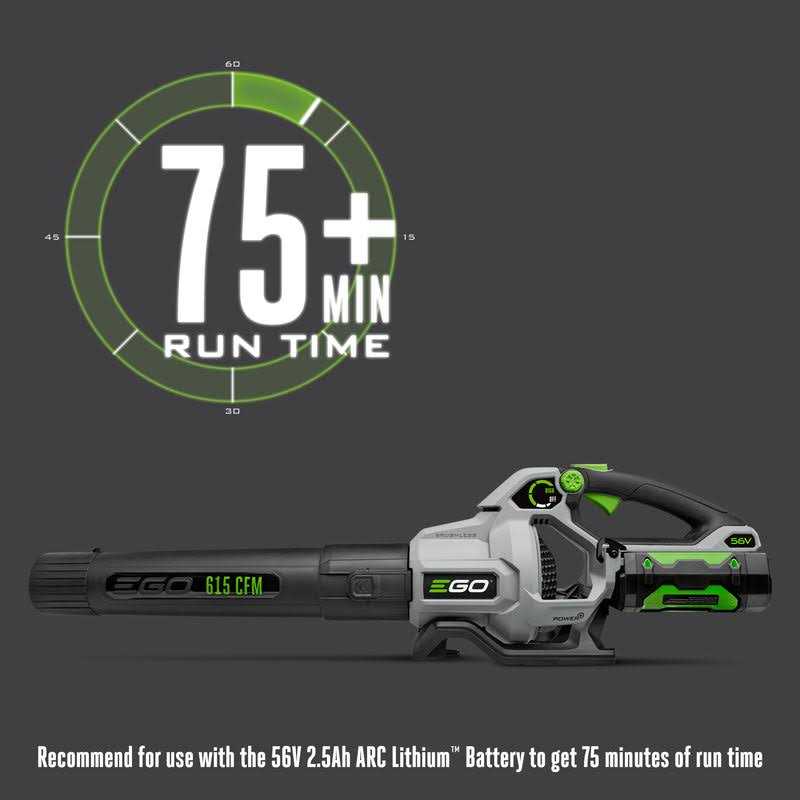 - Recommended for use with the EGO 56V 2.5Ah battery to get up to 75-minutes of continuous run time on a single charge