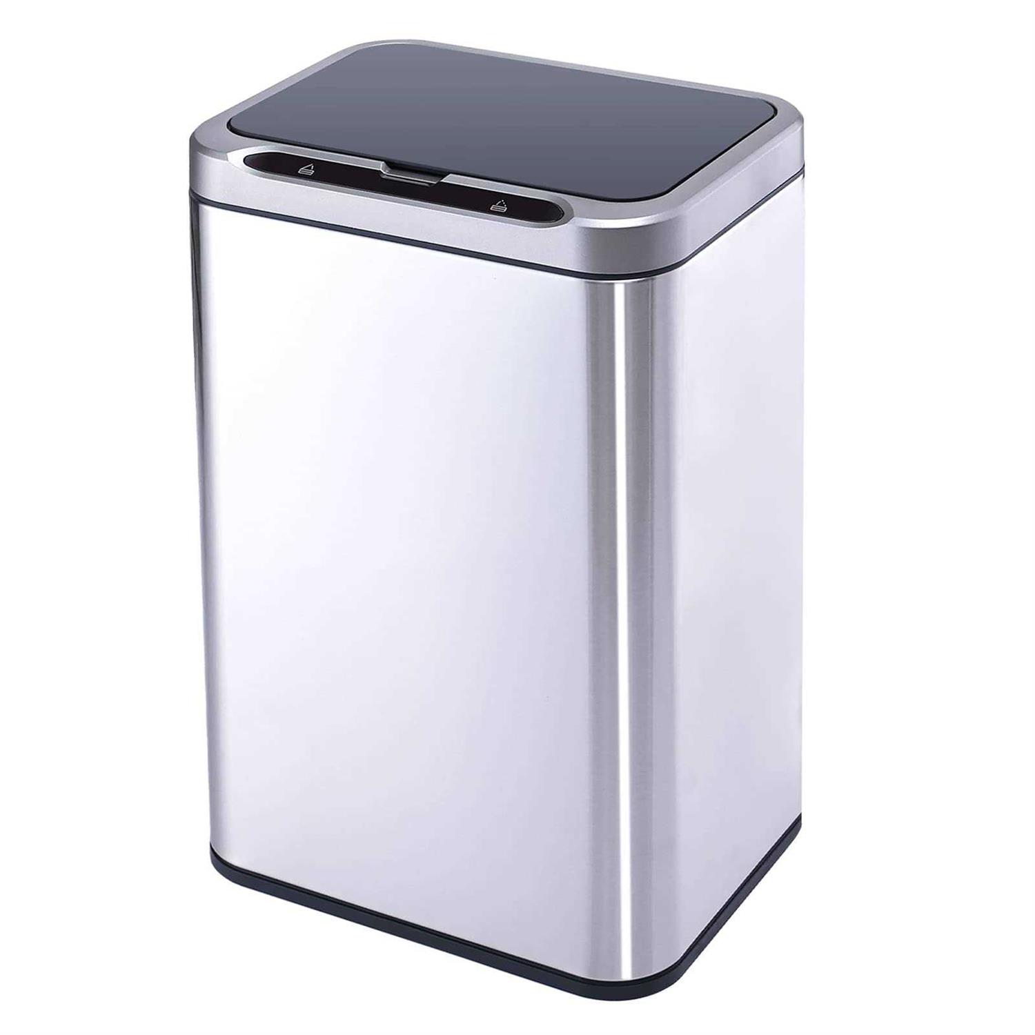 The dimension of it is 11”L×8”W×18.1”H. SMART SENSOR:This trash can is equipped with an infrared sensor and requires 3 AA batteries (not included). When you bring your trash or any part of your body near the sensor, the lid will respond quickly and open automatically within 0.3 seconds. FIXING RING: The fixing ring prevents the garbage bag from running around and fixes it in the right place, and also can hide the garbage bag well to make the garbage can more beautiful. Such a design without inner bucket can also allow greater inner capacity with smaller external dimensions. When you press the button on the right, the lid will descend smoothly. DISPLAY LIGHTS:There are 5 display lights. When you put the garbage or any part of the body in the sensing area, the bucket lid automatically opens and 5 blue display lights turn on. When leaving the sensing area, the blue light starts to read the seconds and the bucket lid closes in 5 seconds. DURABLE MATERIALS:The brushed stainless steel body makes our trash cans fingerprint-proof and durable.The sophisticated rectangular appearance also makes it suitable for a variety of occasions. NOISE AVOIDANCE – Silent and smooth close lid, reducing the noise generated during use. CUSTOM FIT GARBAGE BAGS – Our code C trash bags are designed to fit perfectly in this trash can so they don’t slip and are completely hidden. The extra thick plastic and double stitched construction prevents tears and breakage.