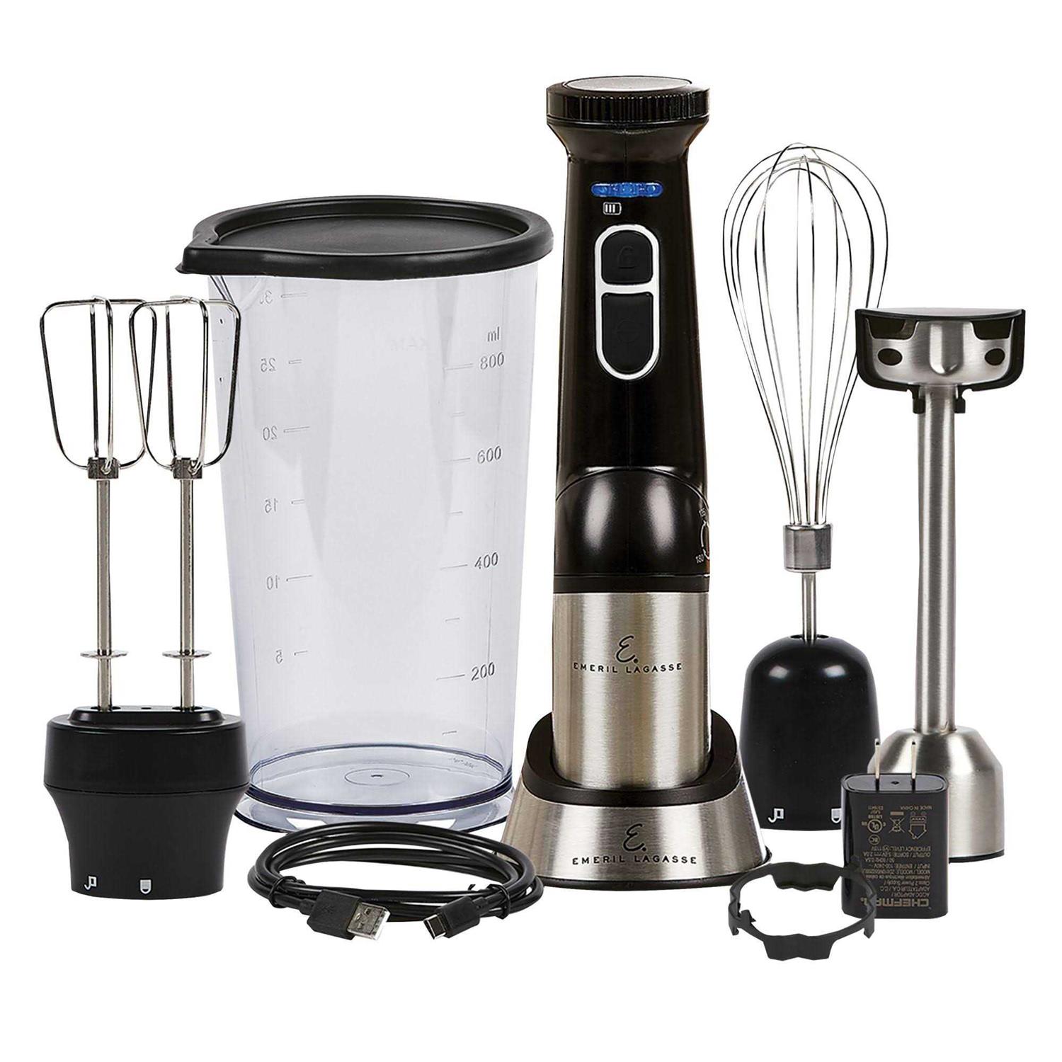 Emeril’s chef-inspired hand blender, Blender and Beyond?, elevates everyday pureeing, mixing, whipping and blending with three ergonomic positions to choose from. Simple, one-handed operation allows you to twist the handle to the position you want and lock easily into place. With one multi-purpose immersion blender, you can create delicate sauces and dips, blend soups and baby food, beat eggs and whipped cream, and make nutritious shakes and smoothies. Variable-speed control from low to high gives you the ability to customize the textures for a variety of blending tasks. Includes blending wand, charging base with adaptor, whisk and double beater attachments, blending jar, recipe book, and blade guard to help protect the immersion blade inside your bowls and cookware.