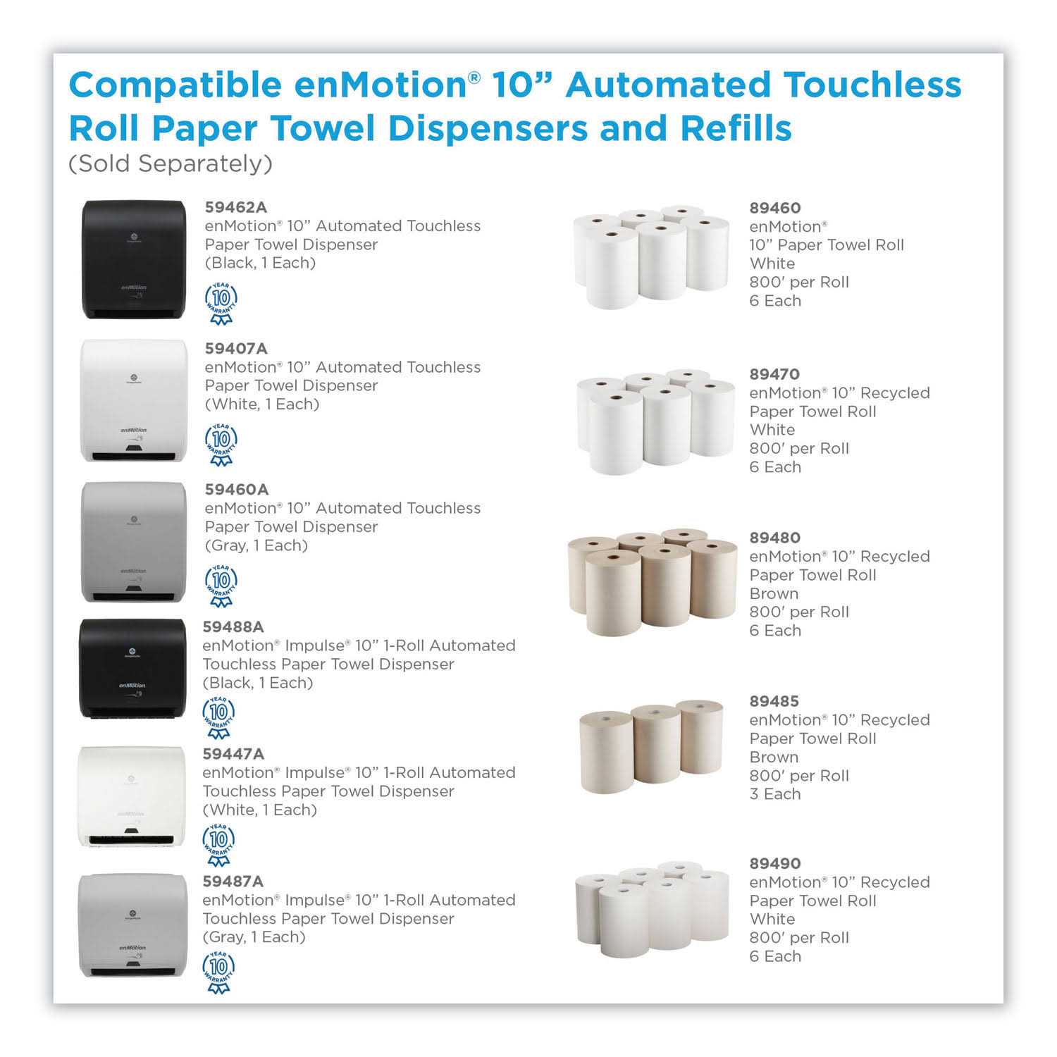 These cost-effective, high-quality, high capacity roll towels are specifically designed to be used with our innovative wall mounted enMotion touch-free dispensers to provide reliable towel dispensing at the wave of a hand. Each high-capacity roll provides up to 800 hand dries for continuous service and reduced service visits. One-at-a-time, touch free dispensing reduces usage and minimizes the risk of cross contamination. 800 Foot roll, 10-inch wide towels deliver up to 800 hand dries per roll for extended service. Provides fast and pleasant hand drying experience. Designed to fit enMotion Classic or enMotion Impulse 10 automated electronic roll towel systems.