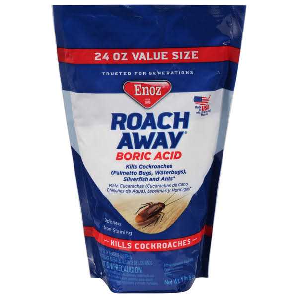 Enoz Roach Away Boric Acid is the ideal way to rid your home of unwanted house guests like cockroaches, palmetto bugs, water bugs, silverfish and many types of ants! To keep unwanted roaches from entering your home, sprinkle the bug killer liberally behind the refrigerator and stove, under the sink and around drain openings. It can also be applied in cracks and crevices along baseboards, corners of cabinets and closets. Enoz Boric Acid is odorless, will not leave a stain and is easy to use.
