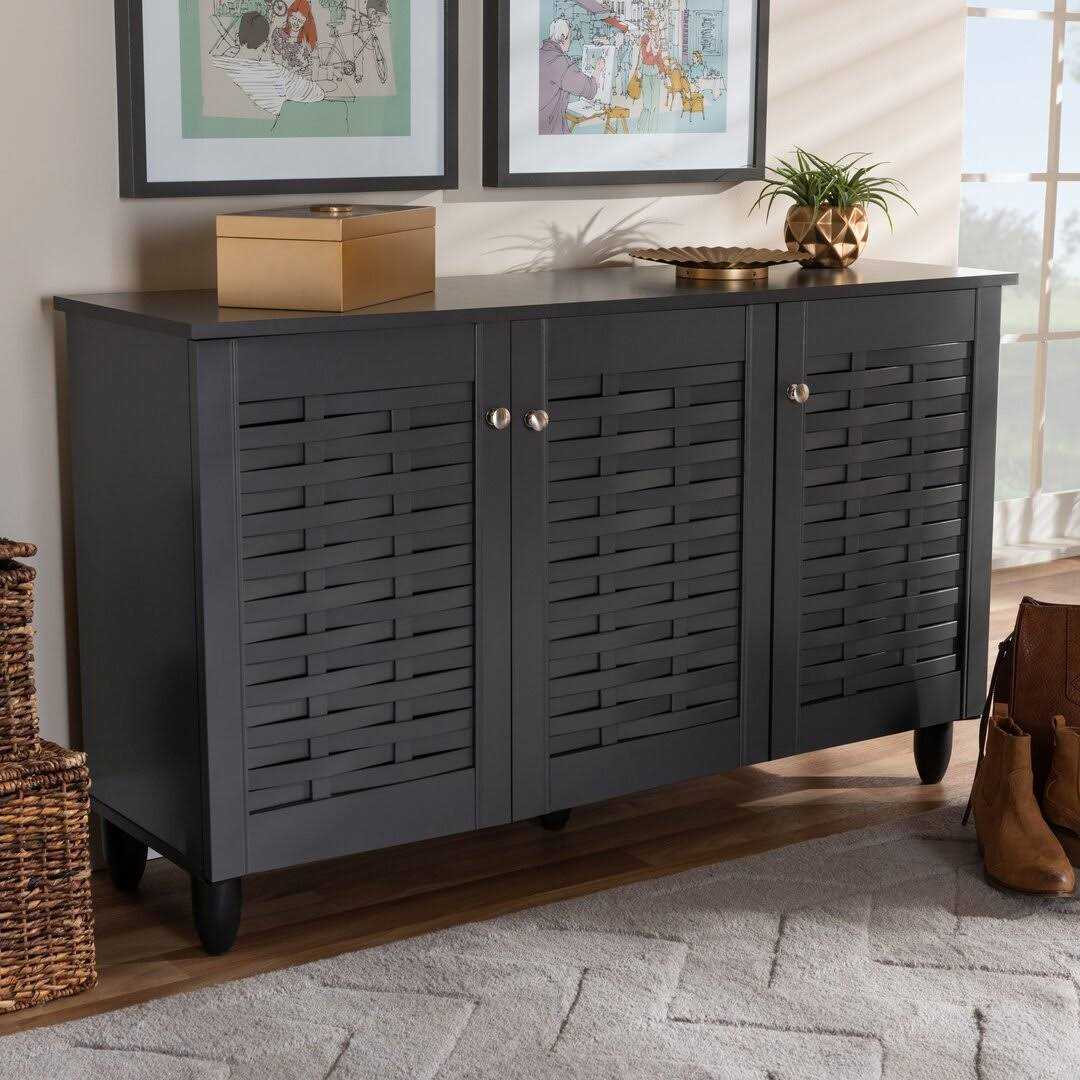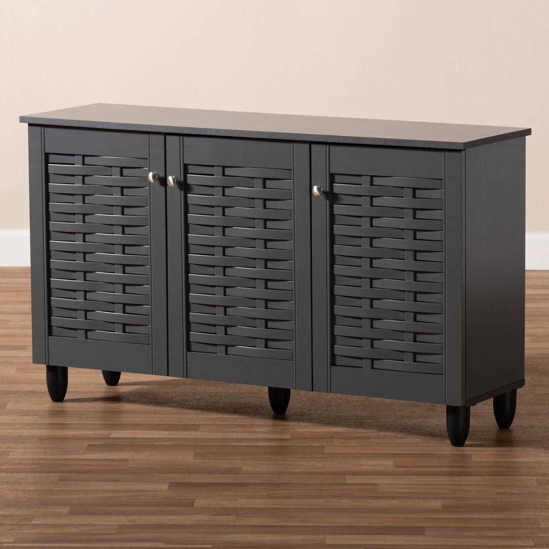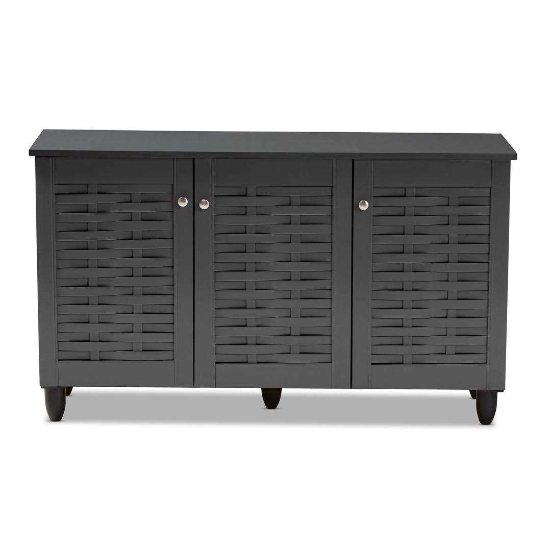 Keep your shoes organized and out of sight with the Winda cabinet. Featuring a stylish contemporary design and dark grey finish, the Winda is easy to coordinate with any style of decor. Three doors conceal four shelves with storage space for up to 12 pairs of shoes. Slits are embedded within the doors to enable air circulation and prevent mold growth on your shoes. The Winda cabinet is made in Malaysia and requires assembly. 26″H X 44″W X 13″D
