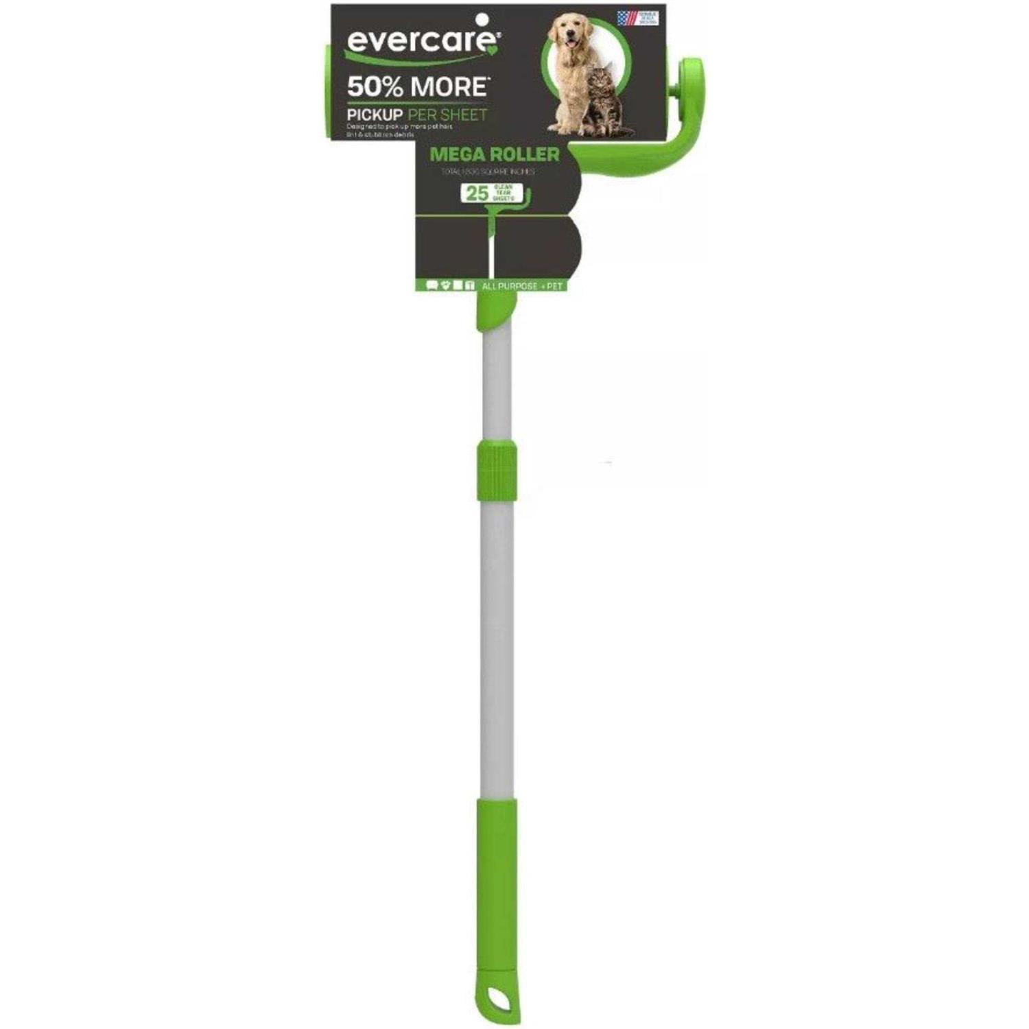 Remove tough pet hair and debris from clothing, furniture and more 10″ Wide roller surface coverage 25 easy peel sheets Forgo the Vacuum and roll the pet hair and debris away. Evercare Pet Mega Extreme Stick Surface Roller features a 10-inch wide roller to easily remove pet hair and debris from bedding, stairs, rugs and more. Save time and skip the vacuum! Surface roller features reusable outer cover, and adjustable 36-inch handle with 25 sheets that are green and white alternating color layers for easier peeling. Additional refills available (model 617136).