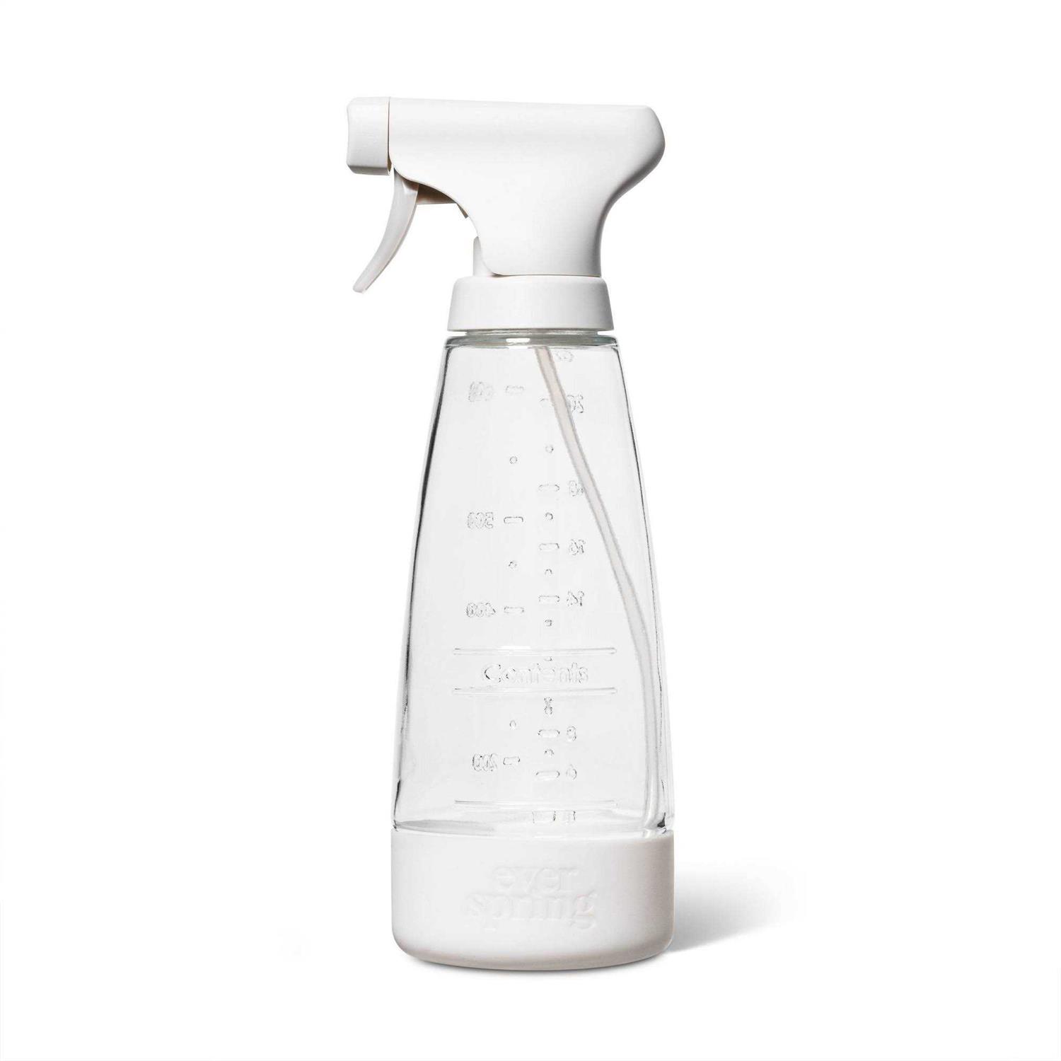 Make cleaning a variety of surfaces around your home a breeze with the help of this handy 20Ounce Glass Spray Bottle from Everspring. Refillable and reusable, this glass cleaning spray bottle is perfect for filling with Everspring Cleaning Concentrates for tidying up around your home without using singleuse plastic containers. Designed with a nonslip silicone base and builtin measuring line for easy mixing and filling, this spray bottle holds up to 20 fluid ounces of cleaner. To fill bottle with cleaner, empty one pack of Everspring Cleaning Concentrate into a clean spray bottle. Add 20 fluid ounces of tap water and replace the bottles sprayer. Shake well, then wait about 5 minutes for the powder to dissolve. Natural settling may occur shake gently before each use. Plus, this convenient BPAfree glass spray bottle is dishwashersafe for easy cleaning. Simply run your glass bottle through the dishwasher and hand wash the sprayer. If buildup occurs, you can soak both pieces in a warm water and vinegar solution. Everspring Downtoearth solutions that are up to Earths standards.Dimensions Overall 10 Inches H x 3.7 Inches W x 3.3 Inches DMaterial Glass