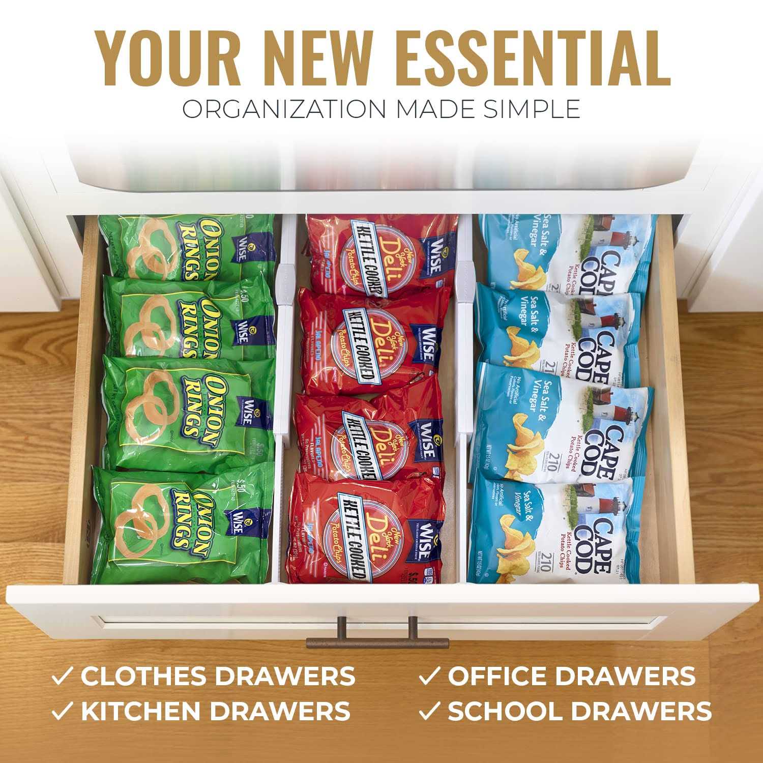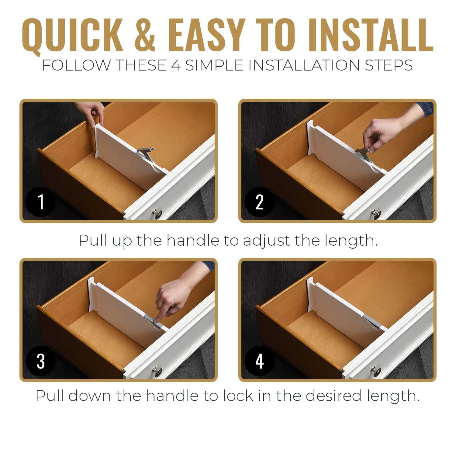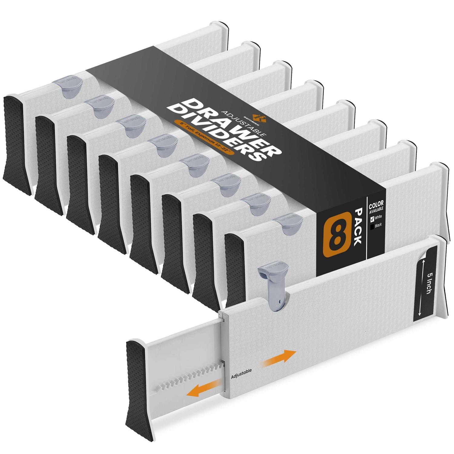 Your Drawers Will Never Be Messy Again! RAPTUROUS presents you with these premium drawer dividers that have been specially designed to keep your drawers organized at all times! Each pack includes 8 white Tall drawer organizers that you can install in any drawer in your house and use as: Dresser drawer dividers Sock and underwear drawer organizers Baby clothes dividers Bathroom drawer organizers Makeup drawer organizers Utensil, silverware and cutlery drawer organizers Desk drawer organizers Toolbox drawer organizers Bookcase and shelf dividers Drawer Dividers That Will Undoubtedly Fit Your Drawers! The best feature of this dresser drawer organizers is their expandable and adjustable design that allows you to install them in ANY drawer! More specifically, the height of these kitchen drawer organizer is 6 inches, while their length can be adjusted between 13.5-22 inches. Thats convenient, right? Smart Design That Will Keep Your Drawers Intact! The edges of our 8 drawer storage organizers are covered with EVA foam sponge, so they are soft and nonslip. In this way, the inner walls of your drawers wont get scratched or damaged, and the clothing dividers will stay securely in place. This Is An Investment You Wont Regret! And why would you? Made with heavy duty plastic and premium quality EVA foam, these drawer dividers are built to last a lifetime! So what are you waiting for? Place an order and deal with your drawer organization one last time! Scroll Up And Click Add to Cart NOW!