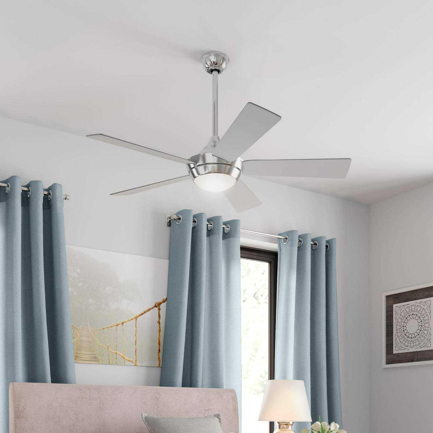 Brushed nickel finish ceiling fan from the Aire Drop collection features 5 blades in a graydark walnut finish. 18-watt LED light kit with frosted glass shade brings overhead illumination to your space. 52-in fan provides airflow up to 5693-CFM making it ideal for large rooms. 4. 5-in L downrod included can also be installed as an angle mount. Includes TR500S hand-held remote control you can control the fan from anywhere in the room. 3 speed settings make it easy to maintain the ideal comfort leve. Reverse air flow feature allows you to change the fans direction setting seasonally.