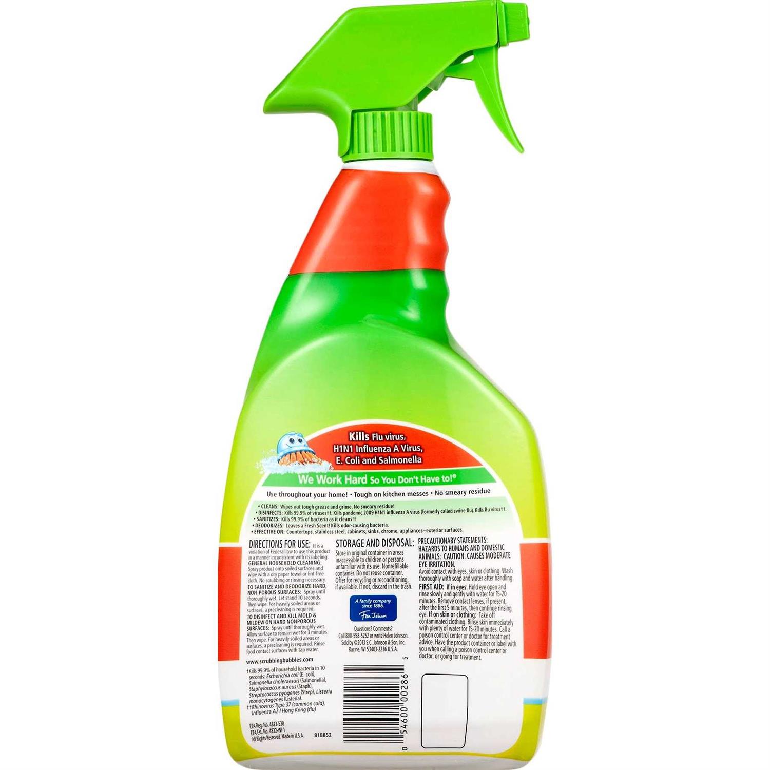 Suddenly everything’s under control. Our heavy duty, multi-purpose cleaner kills 99.9 percent of bacteria as it cleans, cleans 2X better than clorox clean-up and kills the viruses that causes the common cold, flu and Pandemic 2009 H1N1 influenza A virus (formerly called swine flu). It also wipes out tough grease and grime to keep your kitchen cleaner. Plus, it leaves a fresh scent behind with no smeary residue. Directions FOR Use: Spray product onto soiled surfaces and wipe with a dry paper towel or lint-free cloth. No scrubbing or rinsing necessary. TO sanitize and deodorize hard, non-porous surfaces. Let stand 10 seconds. Then wipe. Rinse food contact surfaces with tap water. Unplug electrical appliances before using. Uses: This product works great on cabinets, countertops, microwave exteriors, refrigerator exteriors, bathroom surfaces, chrome fixtures, glass, glazed ceramic tile, walls, porcelain surfaces, linoleum floors, appliances (Exterior Surfaces) & stovetops.