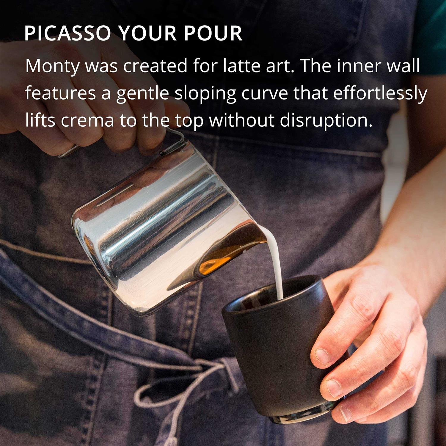 Latte Art Fluid Dynamics – A hidden parabolic slope helps you Picasso your pour by lifting crema to the top without disruption. Stackability – Because you’ll want more than one and a way to store them. Double Wall Ceramic – Keeps your coffee hotter, longer. And because triple seemed a little overboard. Sleek Metal Bottom – For keeping up with the Joneses. Dishwasher Safe – Monty does not need to be hand washed. Meet Monty, a sleek double wall ceramic cup for beautiful espresso drinks. The hidden parabolic slope lifts crema to the top without disruption for perfect latte art.