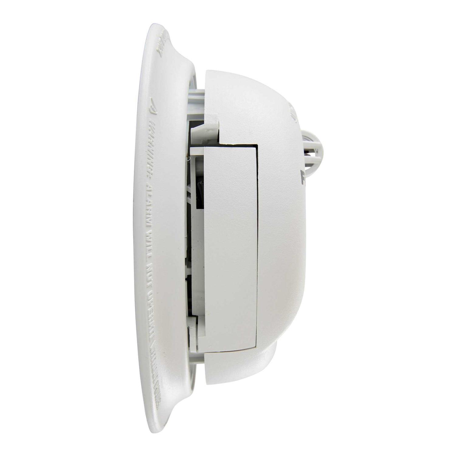 The First Alert HD6135FB Hardwired Heat Alarm with Battery Backup enhances your home’s fire safety by accurately detecting high temperatures and rapidly rising temperatures. Easy to install on a wall or ceiling, this heat detector is ideal for use in crawl spaces, laundry rooms, garages, kitchens, and other areas where smoke alarms aren’t an option. It comes equipped with advanced rate-of-rise sensing technology and a microprocessor that dramatically reduces the number of false alarms. If the temperature reaches 135 degrees Fahrenheit or rises more than 15 degrees Fahrenheit in one minute, the alarm alerts you to the danger with a loud 85-decibel siren. Designed to be wired directly into your home’s electrical system, this 120-volt AC hardwired temperature sensor features a 9-volt backup battery that helps keep the alarm functioning even in the event of a power outage. An intuitive mounting bracket makes installation hassle-free, while an easy-to-access battery drawer allows you to quickly change the battery. The alarm can be configured to work with almost any standard household remote control (sold separately), so you can remotely silence nuisance alarms with the push of a button. And thanks to the convenient test/silence button, it is easy to check alarm function and mute false alarms. This heat alarm can integrate with up to 12 other First Alert or BRK hardwired alarms and up to 6 other compatible devices. It features a latching indicator that identifies which unit triggered the alarm.