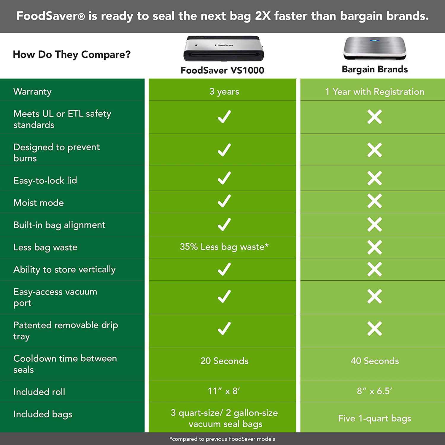 - LESS BAG WASTE: Seals with 35% less bag waste compared to previous FoodSaver models, so you can get the most out of your FoodSaver bags