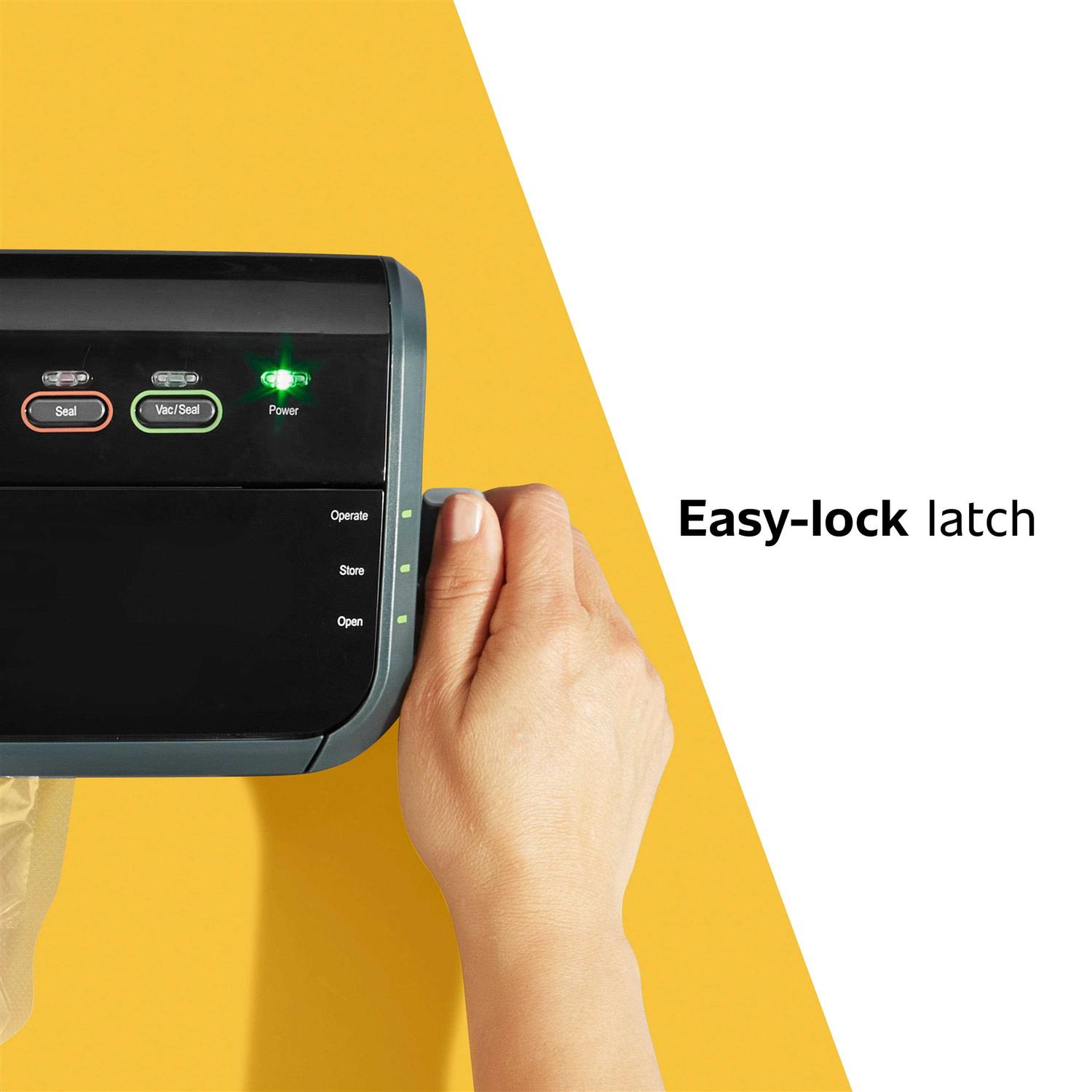 Bag starter kit includes 11 in x 10 ft roll, three quart bags and 2 gal bags. Perfect for countertop or easy storage. Perfect for countertop or easy storage. The FoodSaver vacuum sealer will save you the headache of throwing away perfectly good meals that your regular food storage bags fail to protect. Keeps food fresh. Space-saving design with easy latch and lock operation. Convenient roll storage and roll cutter. Accessory port and hose vacuum seals canisters and marinates food. Compatible with the FA2000-000 handheld sealer for use with FoodSaver zipper bags and All other accessories.