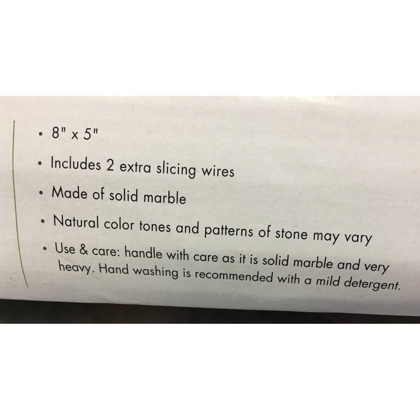 This cheese slicer from Fox Run is made of high quality white marble which helps to maintain a cool temperature for your cheese. The cheese slicer features a strong and durable stainless steel cutting wire that easily cuts through both soft and hard cheeses. Two replacement wires are included as well. Below the marble surface are 4 non-slip rubber feet to keep the slicer from sliding and to protect your counter. The marble cheese slicer measures 20.3 x 12.8cm / 8 x 5 inches and comes in a gift box.