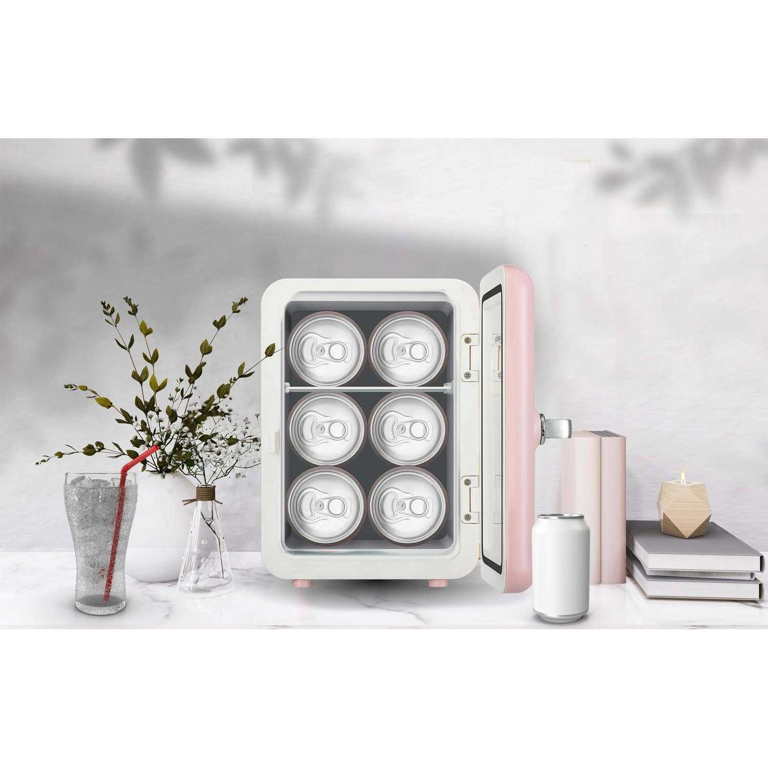 - Holds 6 can capacity, Fun retro design. Plugs into a 12V car adapter or home outlet, both cords are included
