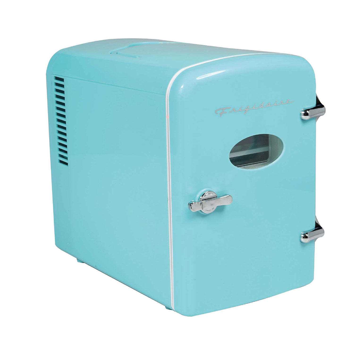 The retro Frigidaire 9 can mini personal beverage refrigerator is a cool and fun way to keep your favorite beverages and snacks cold and can keep your beauty and skin care products cool. The new larger size holds 50% more than our original mini fridge and with the included 12V car adapter, you can take this compact but roomy traveler anywhere you go. The retro design will look great with any dcor whether contemporary or traditional. It is perfect for a dorm room, office or recreational vehicle or van. Its reliable thermoelectric cooling is quiet and vibration free. This mini fridge cools 27-36 degrees Fahrenheit below ambient room temperature.
