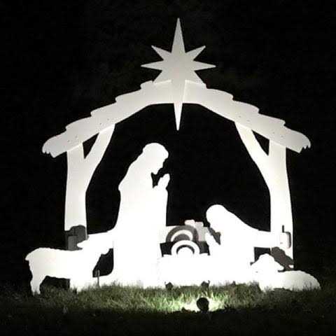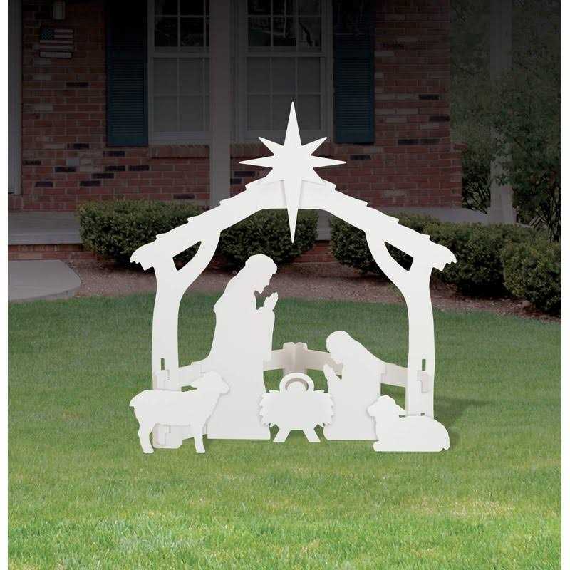 Front Yard Originals Proudly display this stunning silhouette style Nativity that symbolizes the true meaning of Christmas Beautiful during the day, at night this pure white design becomes a real eye-catcher illuminated with just a small spotlight. Youll love the peace and serenity portrayed in this simple yet timeless design so much, it will instantly become your favourite. Quality manufactured with pride in the USA, all pieces are precision cut from durable, all-weather plastic board that will not rot, split, fade or delaminate. This quality display will give you many years of enjoyment. An official licensed product authorized by the copyright owner of the original self-standing silhouette Nativity, this display measures 47 inch wide and 50 inch tall to the top of the star. Yard Stakes are included to hold it in place on those windy days. Ours is the original silhouette Nativity. Our copyrighted design places the Nativity characters closer to the front for better visibility from all angles and distances than rectangular designs. Assembled display (without sheep) can be carried in one piece. Stores flat in the off season. A very high-quality product for the price. Compare other designs at a much higher price.