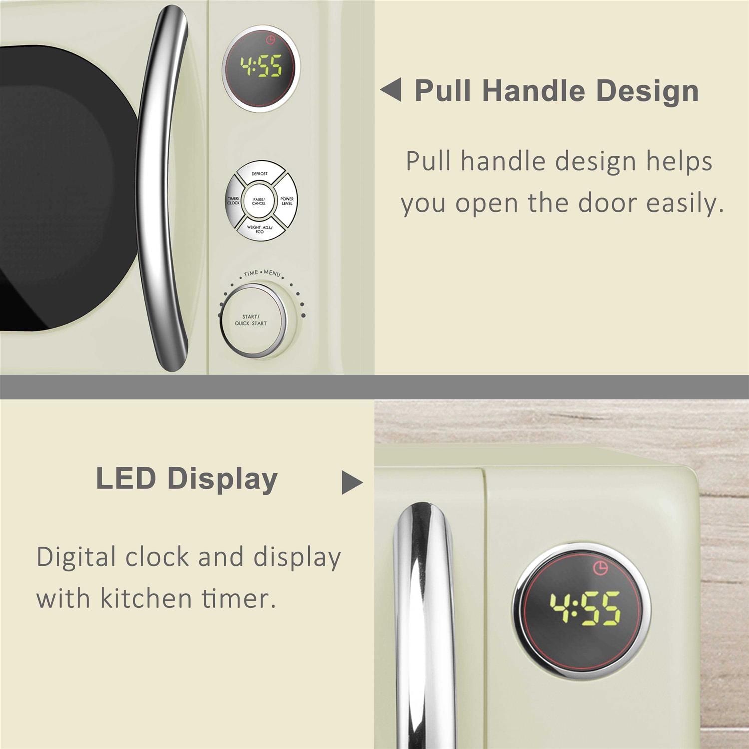 Galanz Retro 0.7 Cu ft Countertop Microwave oven in Cream makes cooking and reheating meals or beverages simple, quick, and convenient. With adjustable power levels, defrost program and weight adj., this microwave oven offers a variety of choices to complete your cooking tasks. The fun Retro design brings a look and feel of the fabulous old days, adding style but still function in your modern kitchen. It is a fun and stylish addition to any kitchen, rec room, home office or dorm room.